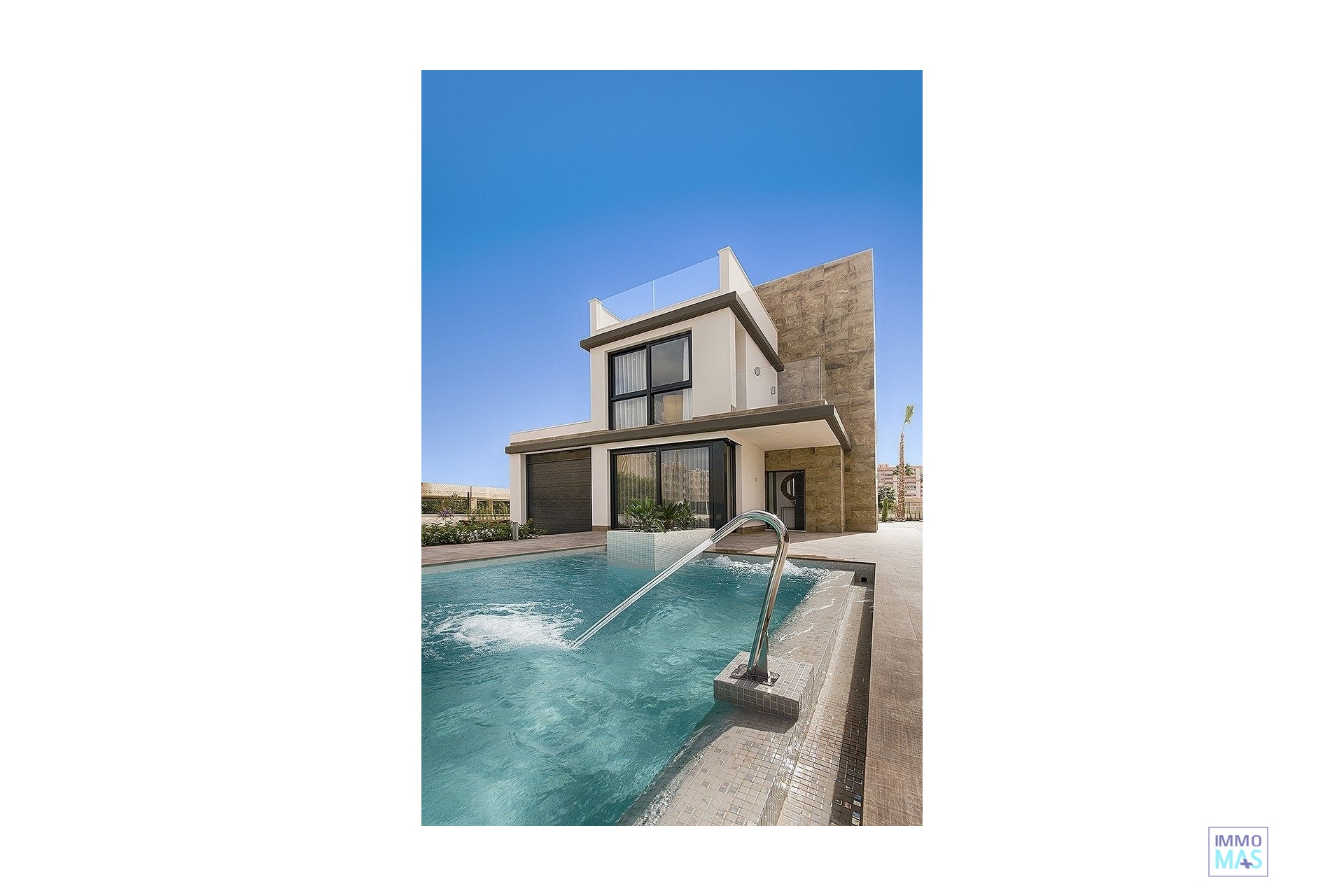 VILLA DE OBRA NUEVA EN ORIHUELA COSTA (CAMPOAMOR) ¿Quieres disfrutar de unas vacaciones exclusivas cerca del mar? Imposible no caer rendido a este ultramoderno chalet en Orihuela Costa de 4 dormitorios, 2 baños, piscina privada, jardín y extras de lujo, según las preferencias personales. Su delicada infraestructura se integra con la naturaleza proporcionando un entorno tranquilo y aislado. Construida con los materiales de la más alta calidad, esta elegante propiedad, se encuentra rodeada de una abundante vegetación y a escasos metros de las playas más limpias de Campoamor: playa de la Glea, Aguamarina y Cabo Roig. Es un gusto tener al alcance estas tres preciosas playas galardonadas con Bandera Azul. Siempre que necesites un momento de reflexión, puedes bajar a rozar sus aguas cristalinas o tumbarte en su suave arena a leer un libro mientras escuchas el plácido sonido del mar. En los alrededores encontrarás todos los servicios imprescindibles para vivir todo el año: supermercados, farmacias, cafeterías, restaurantes, centros comerciales… Y si además te entusiasma el golf, a menos de 10 minutos puedes escoger entre tres privilegiados campos de golf de reconocimiento internacional donde poner a prueba tu puntería: Las Colinas Golf, Villamartín o Las Ramblas. La promoción comprende varios modelos de viviendas de 2,3,4 y hasta 5 dormitorios. Este chalet en concreto consta de 4 dormitorios dobles, 2 baños, cocina americana completamente equipada, salón comedor abierto con una gran iluminación, salida al jardín y la hermosa piscina. Además, el precio incluye: Suelo radiante y espejo en baños Luces interiores y exteriores Armarios empotrados Puerta de seguridad Preinstalación de aire acondicionado Electrodomésticos de primeras marcas La vivienda sigue la tendencia de diseño de concepto abierto, potenciando los espacios amplios y ofreciendo una mayor sensación de comodidad y bienestar en sus interiores.