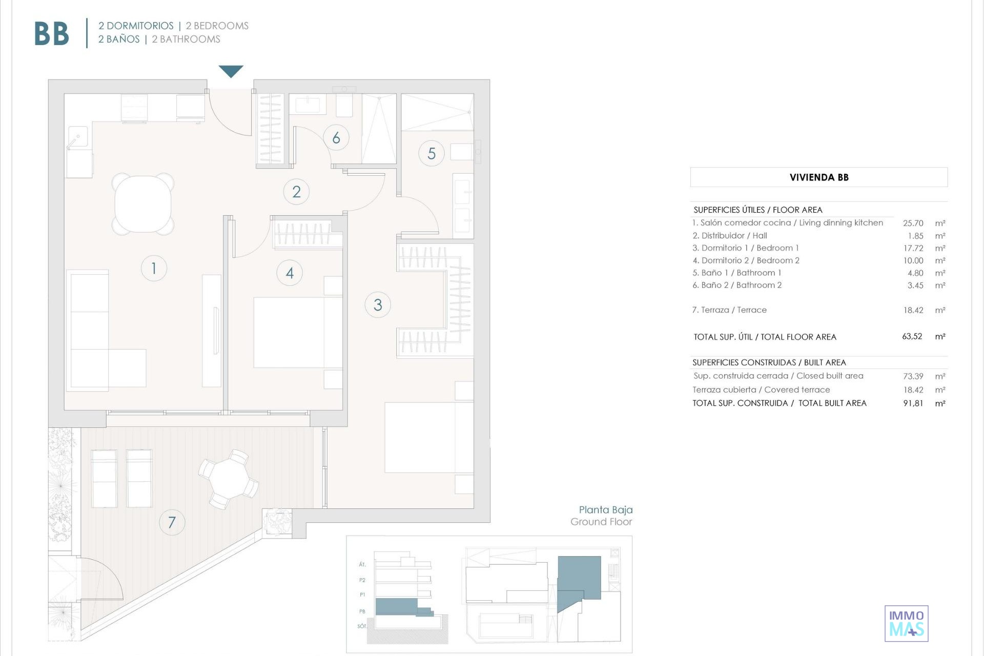 Apartamentos de nueva construcción en Benijófar con una ubicación céntrica Vida residencial contemporánea en Benijófar Esta exclusiva promoción nueva en Benijófar ofrece solo 11 viviendas modernas diseñadas para combinar arquitectura contemporánea, comodidad y materiales de alta calidad. El proyecto incluye apartamentos en planta baja y primera planta con amplias terrazas, así como áticos con terrazas y soláriums privados. Situada en una zona céntrica pero tranquila de Benijófar y frente a una gran zona verde, la urbanización disfruta de una excelente luz natural durante todo el día y de unas agradables vistas abiertas. Apartamentos modernos con características de primera calidad Cada propiedad ha sido cuidadosamente diseñada para cumplir con altos estándares de calidad y funcionalidad. Todas las viviendas incluyen una plaza de garaje privada y un trastero en el sótano, con cómodo acceso en ascensor. Los residentes también pueden disfrutar de una elegante piscina comunitaria rodeada de zonas comunes ajardinadas, ideal para relajarse y socializar. Los áticos destacan por sus amplios soláriums, que ofrecen la posibilidad de instalar una cocina al aire libre y cuentan con un jacuzzi, creando un espacio exterior único perfecto para entretenerse o relajarse bajo el sol del Mediterráneo. Acabados de alta calidad y eficiencia energética La residencia se ha construido prestando especial atención a la durabilidad, la eficiencia y la estética moderna. Las características incluyen: Preinstalación de aire acondicionado y calefacción por conductos Carpintería exterior con rotura de puente térmico y doble acristalamiento Sistema aerotérmico para agua caliente sanitaria Cocinas amuebladas con electrodomésticos incluidos Paquete de iluminación interior y exterior incluido Baños con tocadores, espejos y mamparas de ducha Jacuzzi incluido en los soláriums de los áticos Cada detalle ha sido seleccionado para garantizar un entorno de vida cómodo, eficiente y elegante. Estilo de vida y ubicación de Benijófar Benijófar es uno de los pueblos con más encanto de la Vega Baja, conocido por su ambiente relajado, su seguridad y su excelente calidad de vida. Todos los servicios cotidianos, como supermercados, colegios, centros médicos, restaurantes y zonas de ocio, se encuentran a menos de 5 minutos. El pueblo ofrece el equilibrio perfecto entre la vida tradicional española y las comodidades modernas. Distancias clave a puntos de interés Playas de Guardamar del Segura: 8 km Campos de golf La Finca y La Marquesa: 6 km Parque acuático de Rojales: 4 km Centro comercial Zenia Boulevard: 17 km Aeropuerto de Alicante: 35 km Su nuevo hogar en la Costa Blanca le espera Estos apartamentos de nueva construcción en Benijófar ofrecen una combinación excepcional de ubicación, calidad y diseño. Póngase en contacto con nosotros hoy mismo para concertar una visita y asegurarse su nuevo hogar en la Costa Blanca.