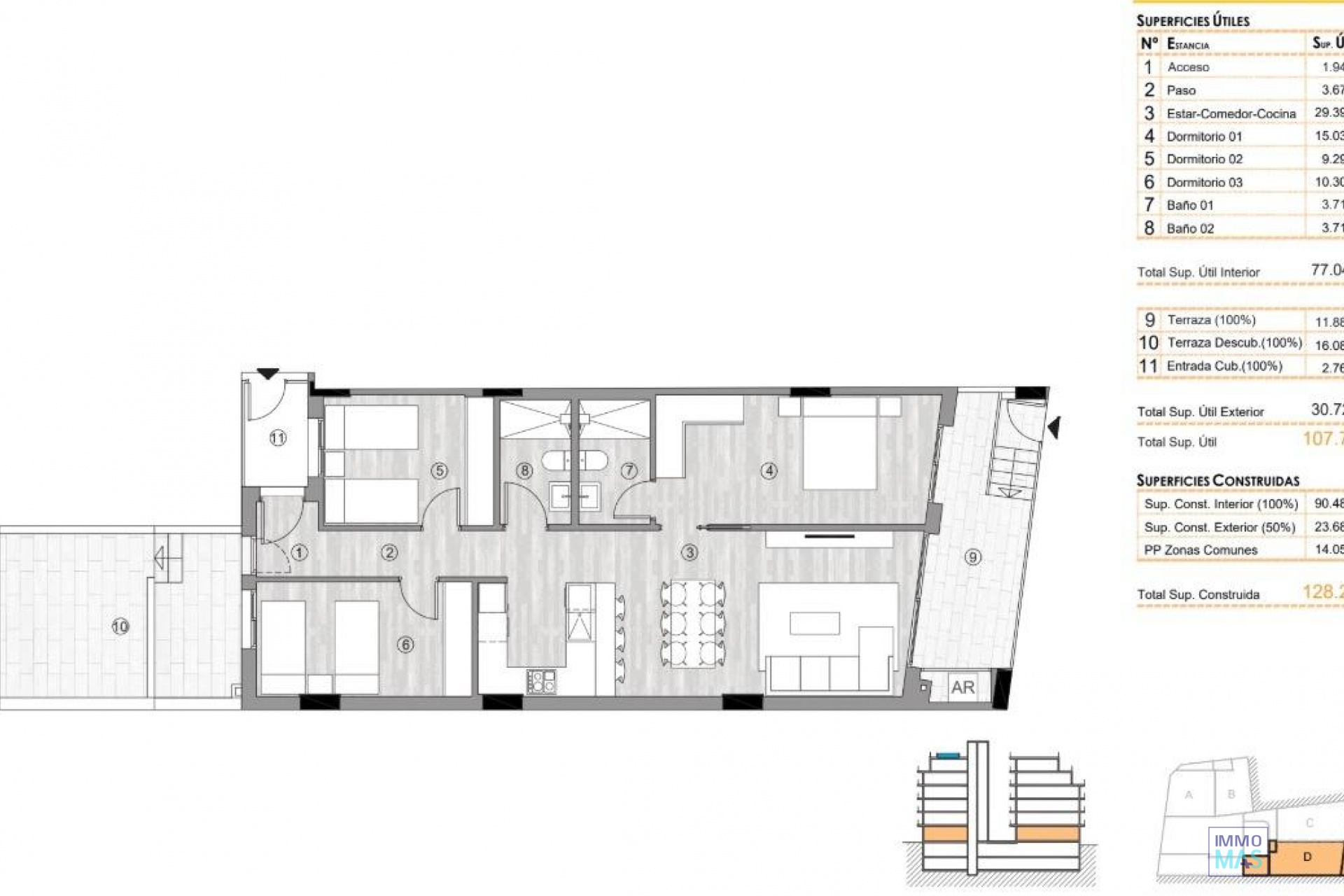 Apartamentos de nueva construcción en el corazón de Torrevieja A solo 400 m de la Playa del Cura Ubicación privilegiada en el centro de Torrevieja Este nuevo edificio residencial goza de una ubicación inmejorable en el centro de Torrevieja, a solo 400 m de la Playa del Cura. Rodeado de tiendas, supermercados, restaurantes y servicios cotidianos, ofrece todo lo necesario a poca distancia. La zona también cuenta con parques, zonas de ocio y áreas verdes, creando un equilibrio perfecto entre las comodidades urbanas y los momentos de relax. Viviendas modernas de 2 y 3 dormitorios La promoción ofrece una selección de apartamentos de 2 y 3 dormitorios, incluyendo áticos, algunos de ellos con soláriums privados. Cada vivienda está diseñada con un estilo contemporáneo, con distribuciones diáfanas, amplias terrazas y cocinas integradas de estilo americano. Los baños están totalmente equipados con muebles, mamparas de ducha y calefacción por suelo radiante. Las cocinas incluyen electrodomésticos y cada apartamento cuenta con preinstalación para aire acondicionado por conductos. Hay disponibles plazas de aparcamiento subterráneo y trasteros opcionales. Instalaciones de estilo resort para el bienestar Los residentes pueden disfrutar de una amplia gama de servicios exclusivos. La planta baja cuenta con un gimnasio totalmente equipado, ideal para el entrenamiento diario. El solárium de la azotea ofrece un auténtico oasis de relajación con tumbonas, sauna finlandesa y minipiscina. Tanto el ascensor como las escaleras conectan directamente con la azotea para ofrecer la máxima comodidad y accesibilidad. Vivir en un entorno natural y costero único Torrevieja es conocida por su cálido clima mediterráneo, con una temperatura media anual de 20 ºC, lo que la convierte en un lugar perfecto para vivir durante todo el año. La ciudad es famosa por sus lagunas salinas naturales y el Parque Natural protegido de La Mata y Torrevieja, situado a solo 4 km de la urbanización. Sus lagos rosados y verdes, sus pintorescas rutas de senderismo y su rica biodiversidad ofrecen un estilo de vida saludable e inspirador. Distancias a puntos de interés clave Playa del Cura 0,4 km Puerto deportivo de Torrevieja 1 km Parque Natural de La Mata 4 km Villamartin Golf 8 km Aeropuerto de Alicante 45 km Aeropuerto de Murcia 60 km Experimente el estilo de vida mediterráneo No pierda la oportunidad de adquirir una vivienda moderna en una de las ciudades costeras más deseadas de la Costa Blanca. Póngase en contacto con nosotros hoy mismo para concertar una visita y asegurarse su lugar en esta excepcional nueva promoción.