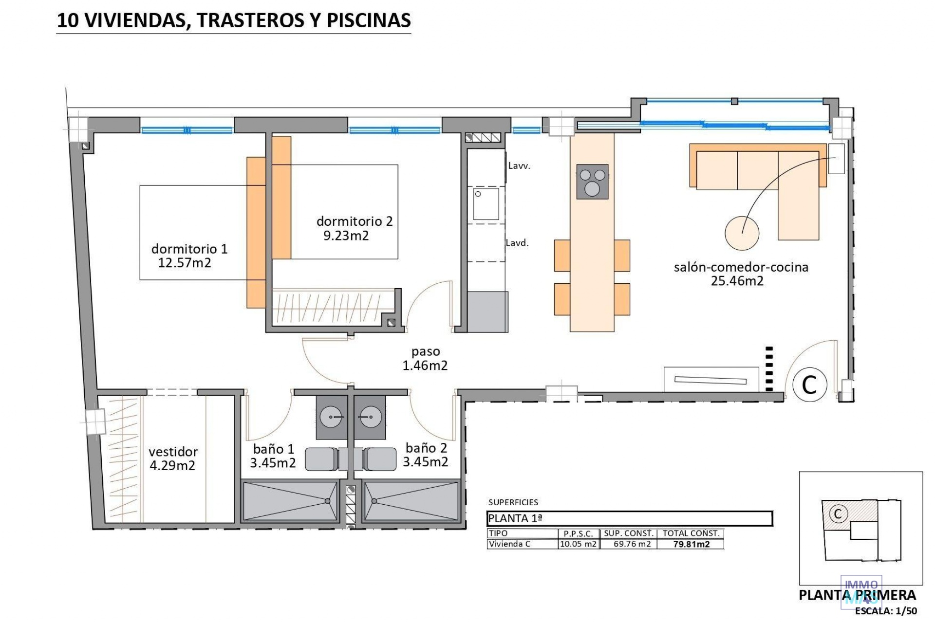 Apartamentos de nueva construcción a solo 100 m de la playa en Lo Pagán, San Pedro del Pinatar Exclusiva urbanización costera en una ubicación privilegiada Este complejo residencial de nueva construcción consta de solo 10 modernos apartamentos situados en Lo Pagán, San Pedro del Pinatar, a menos de 100 metros de la playa. Ubicado en una de las zonas más atractivas del Mar Menor, este complejo ofrece una combinación perfecta entre el confort de vivir junto al mar y un excelente potencial de inversión. Lo Pagan es conocida por su ambiente relajado, sus baños de barro naturales y su proximidad tanto al Mar Menor como al mar Mediterráneo. Apartamentos modernos y una opción única de ático El proyecto ofrece amplios apartamentos de dos dormitorios con dos baños, incluyendo un dormitorio principal con baño en suite. Todas las viviendas cuentan con cocinas abiertas conectadas a luminosas zonas de estar, creando espacios funcionales y acogedores. Lo más destacado de la promoción es un exclusivo ático de tres dormitorios y tres baños con una gran terraza, un solárium privado en la azotea y su propia piscina, que ofrece un estilo de vida excepcional con privacidad y vistas despejadas. Acabados de alta calidad y características de confort Todas las viviendas están construidas con altos estándares de calidad e incluyen baños equipados con muebles, espejos iluminados, toalleros eléctricos y mamparas de ducha. Las cocinas están totalmente equipadas con electrodomésticos y armarios modernos. Las persianas motorizadas y el sistema de aire acondicionado por conductos totalmente instalado garantizan el confort durante todo el año. Hay plazas de aparcamiento y trasteros opcionales disponibles con un coste adicional, lo que proporciona una comodidad extra a los residentes. Atractivas zonas comunes El complejo residencial cuenta con una piscina comunitaria ideal para relajarse y disfrutar del clima mediterráneo. El número limitado de unidades garantiza un entorno tranquilo y exclusivo, perfecto tanto para vivir de forma permanente como para pasar las vacaciones. Estilo de vida en Lo Pagán y San Pedro del Pinatar San Pedro del Pinatar goza de una ubicación privilegiada entre el Mar Menor y el mar Mediterráneo, lo que lo convierte en un destino muy popular para los amantes de los deportes náuticos y la playa. La zona cuenta con puertos deportivos, clubes náuticos y aguas poco profundas y seguras, ideales para las familias. Lo Pagan es famoso por sus baños de barro naturales y su largo paseo marítimo, repleto de restaurantes, cafeterías y tiendas. La ciudad ofrece excelentes instalaciones, como centros deportivos, una piscina cubierta y actividades sociales durante todo el año, gracias a su clima templado en invierno. Excelente conectividad y servicios cercanos El centro comercial Dos Mares está a solo 2 km y ofrece una amplia gama de tiendas, restaurantes y opciones de ocio. El puerto deportivo y el puerto de San Pedro del Pinatar se encuentran a aproximadamente 1,5 km de la urbanización. Los amantes del golf encontrarán varios campos a poca distancia en coche, incluido el Lo Romero Golf, a unos 10 km. Distancias clave a puntos de interés Playa de Lo Pagán: 0,1 km Puerto deportivo de San Pedro del Pinatar: 1,5 km Centro comercial Dos Mares: 2 km Lo Romero Golf: 10 km Aeropuerto de Murcia Corvera: 35 km Aeropuerto de Alicante: 80 km Asegure hoy mismo su vivienda junto a la playa Póngase en contacto con nosotros ahora para recibir más información o concertar una visita a estos exclusivos apartamentos de nueva construcción a pocos pasos de la playa en Lo Pagán, San Pedro del Pinatar. 421
