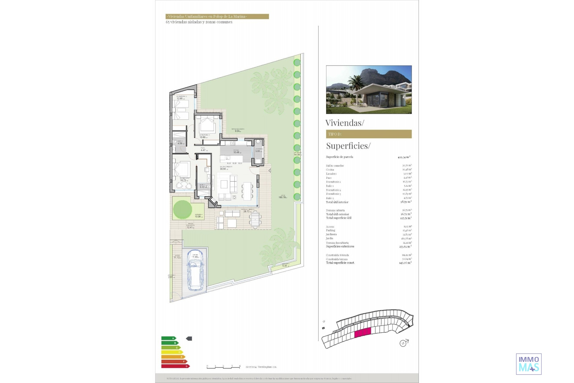 Villas neuves à Polop, Alicante Une vie moderne entourée par la nature Découvrez ce lotissement exclusif de villas neuves à Polop, un charmant village de l'arrière-pays situé dans la province d'Alicante. À seulement 10 km des plages animées et de la vie nocturne de Benidorm et à proximité de la ville pittoresque d'Altea, ces maisons offrent une combinaison imbattable de confort moderne et de beauté naturelle. Un projet résidentiel adapté à vos besoins Le projet se compose de 65 villas indépendantes disponibles dans différents agencements pour répondre à vos besoins et à votre budget. Vous avez le choix entre des maisons de 3 ou 4 chambres à coucher, avec des options de conception à un ou deux étages. De nombreuses propriétés sont conçues sur un seul niveau, offrant une meilleure accessibilité et une expérience de vie confortable sans avoir besoin d'escaliers. Chaque maison est conçue avec soin et dispose de terrasses spacieuses, de jardins privés et d'espaces intérieurs/extérieurs où vous pourrez profiter du climat méditerranéen. Des piscines privées sont également disponibles en option pour ajouter une touche de luxe supplémentaire à votre nouvelle maison. Une situation privilégiée avec un accès facile aux principales destinations Situé dans un cadre naturel paisible, le projet est idéal pour ceux qui recherchent la tranquillité sans sacrifier la commodité. Les environs permettent d'accéder aux principaux centres d'intérêt : Plages de Benidorm : 10 km (15 minutes en voiture) Playa del Albir : 12 km (20 minutes), réputée pour ses eaux pures et sa promenade pittoresque. Aéroport d'Alicante : 60 km (45 minutes) Terrain de golf de Villaitana : 12 km (15 minutes) Centre commercial La Marina : 10 km (15 minutes) Des équipements haut de gamme pour un confort moderne Chaque villa est équipée de finitions de haute qualité et de systèmes de pointe, garantissant un maximum de confort, de sécurité et de durabilité : Fenêtres en PVC à double vitrage avec isolation thermique et solaire Portes d'entrée renforcées pour une sécurité accrue Cuisines entièrement équipées avec plaque de cuisson à induction, four, hotte aspirante et évier en acier inoxydable. Salles de bains modernes avec lavabos et robinetterie en porcelaine de style Climatisation préinstallée avec pompe à chaleur Eau chaude fournie par des systèmes aérothermiques pour une meilleure efficacité énergétique Communauté fermée avec caméras de surveillance Polop : L'alliance parfaite de l'histoire et de la nature Polop de la Marina est une ville historique entourée de paysages époustouflants. Le charme de sa vieille ville, la maison-musée Gabriel Miró et les nombreux sentiers de randonnée en font une destination recherchée par les amateurs de nature et d'histoire. Vivre la côte et la campagne Adoptez un nouveau style de vie dans ces maisons soigneusement conçues, où le confort rencontre la nature. Profitez des vues panoramiques grâce aux grandes fenêtres qui encadrent le paysage environnant, créant ainsi un équilibre parfait entre l'intérieur et l'extérieur. Ne manquez pas l'occasion de devenir propriétaire de la maison de vos rêves à Polop ! Contactez-nous dès aujourd'hui pour plus d'informations et pour planifier une visite.