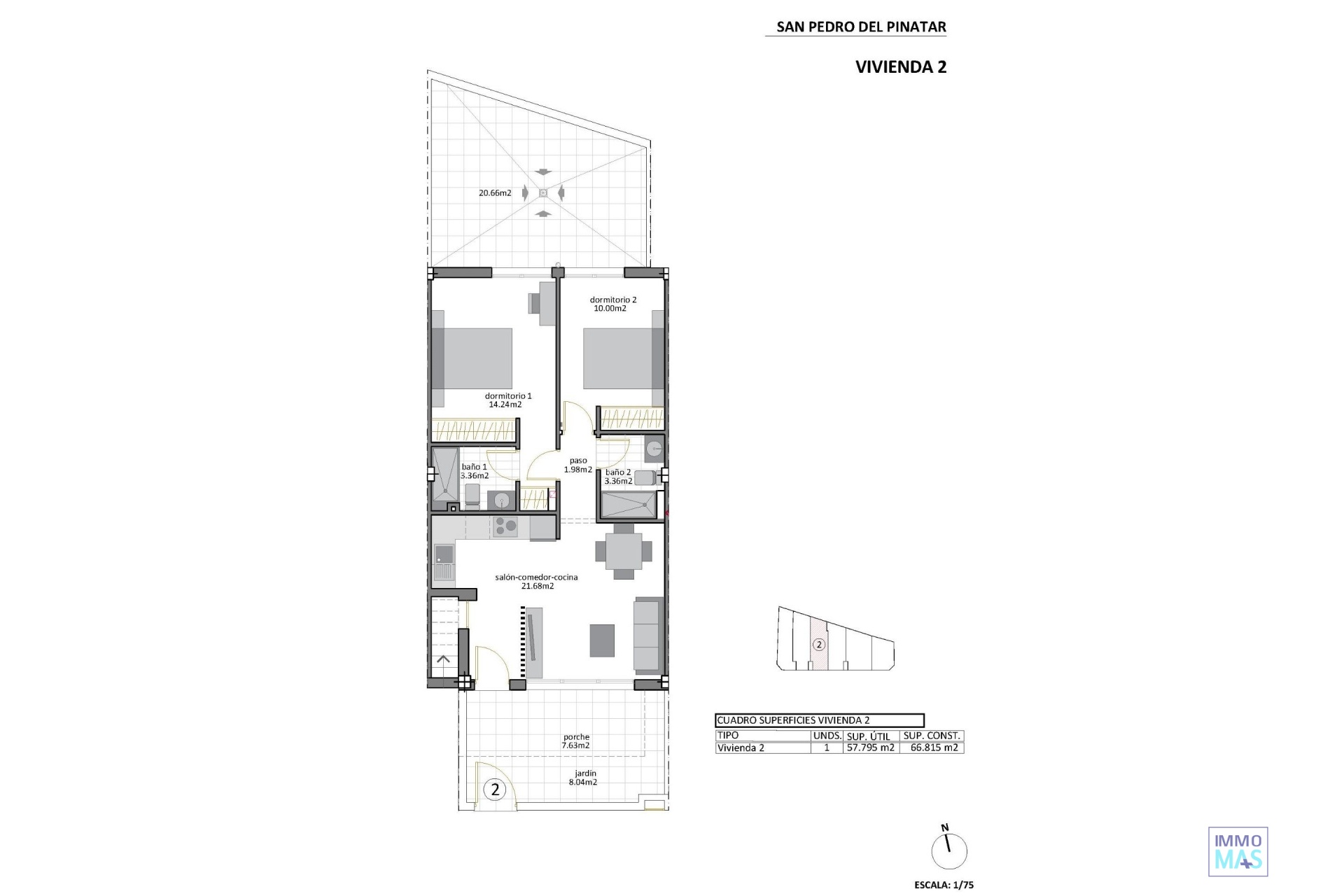 Bungalows nouvellement construits à San Pedro del Pinatar - Situation privilégiée à 500 m de la plage Maisons exclusives de style boutique près de la côte Découvrez ces élégants bungalows neufs au cœur de San Pedro del Pinatar, à seulement 500 mètres des superbes plages de la Mar Menor. Ce lotissement de charme ne comprend que huit maisons caractéristiques, alliant design moderne, confort et mode de vie côtier paisible. Modèles disponibles pour s'adapter à votre style de vie Modèle rez-de-chaussée/jardin : Ce modèle comprend une terrasse à l'avant et un patio spacieux à l'arrière, parfaits pour vivre à l'extérieur. Modèle Penthouse Loft : Comprend un solarium privé sur le toit et une terrasse avant, offrant des vues dégagées et une abondance de lumière. Détails du modèle rez-de-chaussée/jardin Entrez dans un espace de vie lumineux qui se connecte de manière transparente à la salle à manger et à une cuisine entièrement équipée. De grandes portes coulissantes en verre laissent entrer la lumière naturelle, créant une ambiance ouverte et accueillante. L'aménagement comprend deux chambres spacieuses, dont la chambre principale dotée d'une salle de bains attenante, ainsi qu'une salle de bains familiale moderne. Points forts du modèle Penthouse L'accès au penthouse se fait par un escalier privé menant à une grande terrasse. À l'intérieur, un salon et une salle à manger ouverts se mêlent à une cuisine entièrement équipée. Deux chambres à coucher sont incluses, la chambre principale disposant d'une salle de bains attenante. Un solarium privé sur le toit, accessible depuis la cuisine, constitue un endroit idéal pour se détendre ou se divertir. Des rangements supplémentaires au rez-de-chaussée assurent la commodité de l'ensemble. Principales caractéristiques et commodités Éclairage LED intérieur et extérieur. Cuisine entièrement équipée avec plaque de cuisson à induction, four, lave-vaisselle et réfrigérateur/congélateur. Climatisation installée. Place de parking réservée. Jardin commun paysager avec piscine pour les résidents. San Pedro del Pinatar : charme côtier et commodité Situé sur les magnifiques côtes de la Mar Menor et de la Méditerranée, San Pedro del Pinatar est un paradis pour les amateurs de sports nautiques, de voile et de plage. La région voisine de Lo Pagán offre des bains de boue naturels, des eaux calmes et des services tout au long de l'année, notamment des boutiques, des restaurants et des installations de loisirs. Distances des principaux centres d'intérêt : Centre commercial Dos Mares : Centre commercial Dos Mares : 5 km Aéroport de Murcia/Corvera : 30 km Aéroport d'Alicante : 75 km Terrains de golf locaux : 10-20 km Marina et clubs de voile : 2 km Réservez votre maison de rêve dès aujourd'hui L'achèvement des travaux étant prévu pour la fin de l'année 2025, c'est le moment idéal pour réserver votre nouvelle maison à San Pedro del Pinatar. Ne manquez pas cette occasion de profiter d'un mélange d'élégance moderne et de tranquillité côtière. Contactez-nous dès aujourd'hui pour en savoir plus ou pour organiser une visite !