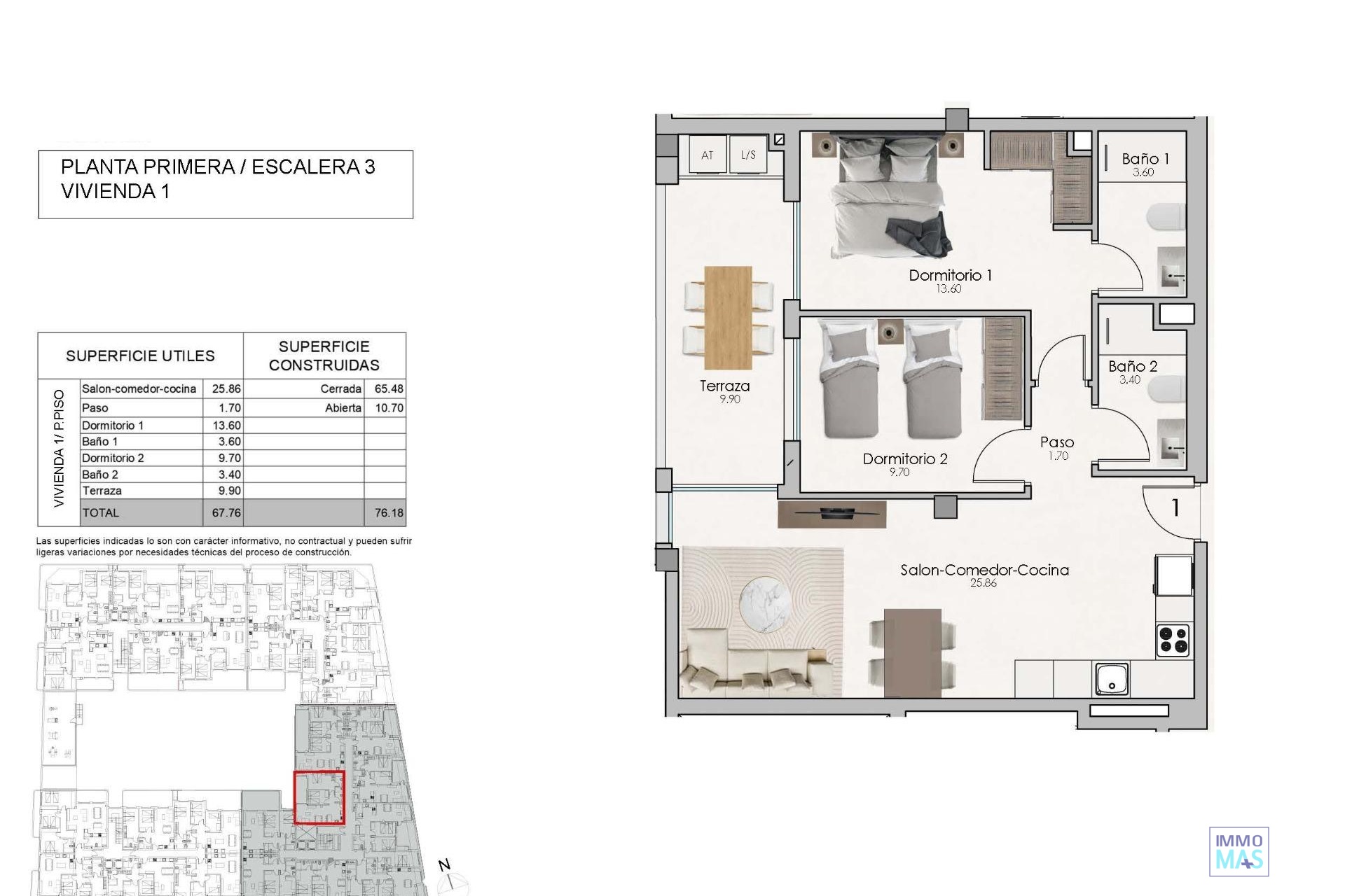 NOUVEAU COMPLEXE RÉSIDENTIEL A SANTA POLA Nouveau complexe résidentiel moderne fermé comprenant des appartements et des penthouses de 1, 2 et 3 chambres à coucher avec 2 salles de bains complètes. Le complexe se compose de 4 escaliers d'appartements avec de vastes espaces communs paysagers, y compris une piscine, un espace de détente et un gymnase. Toutes les propriétés ont été soigneusement conçues pour vous offrir une expérience de vie exceptionnelle, avec des finitions de haute qualité et un style moderne. Profitez des vastes terrasses, où vous pourrez vous détendre, manger en plein air et admirer les couchers de soleil les plus spectaculaires. L'emplacement est tout simplement imbattable : à côté du centre de Santa Pola et de la palmeraie, et à seulement quelques minutes de la promenade, vous serez à proximité d'un large éventail de restaurants, de bars et de supermarchés. Excellente connexion avec la route nationale 332, qui relie tout le sud de la Costa Blanca, et avec l'aéroport en seulement 15 minutes.