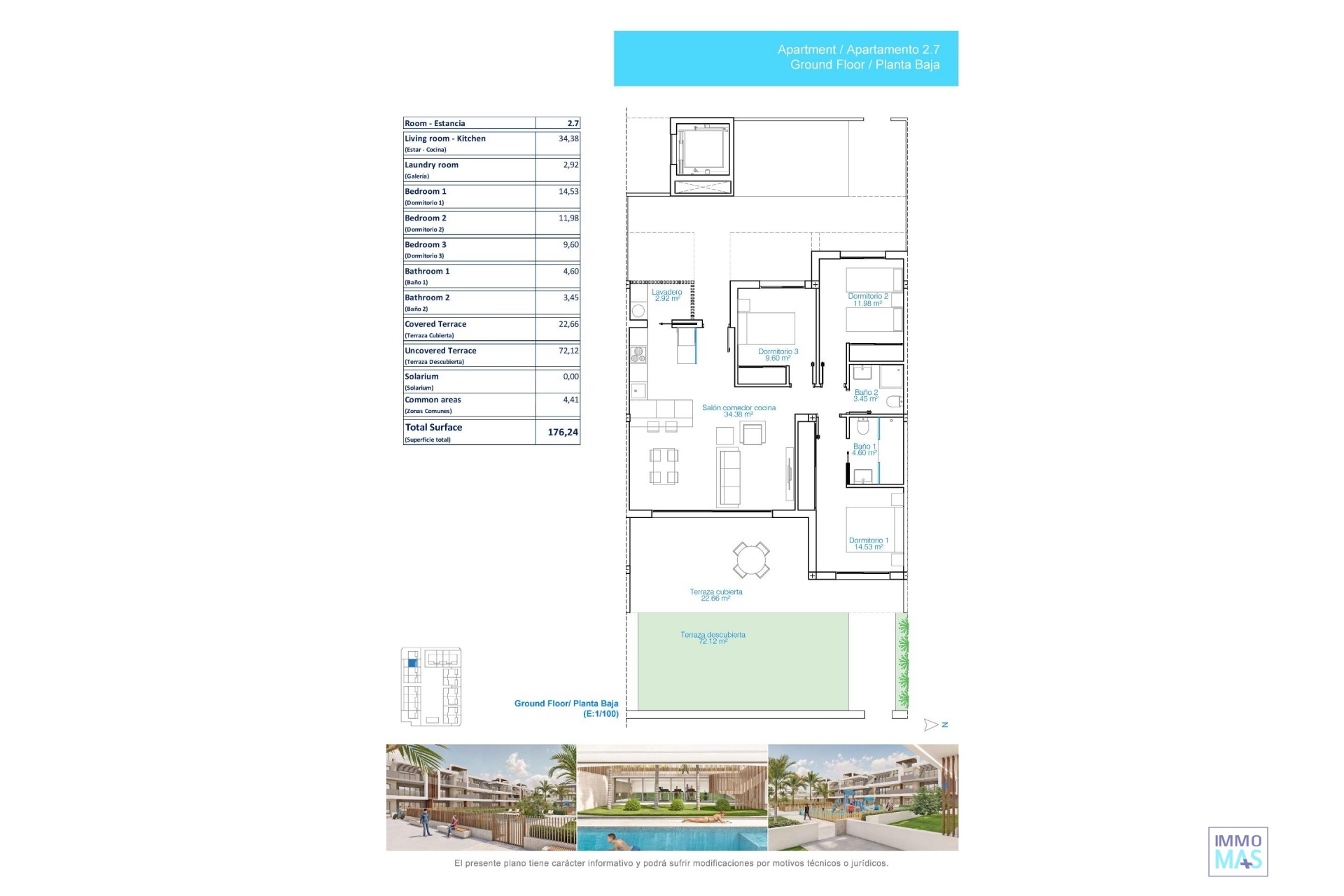 Appartements touristiques de luxe à 150 mètres de la plage de Las Higuericas - Torre de la Horadada Nouveau projet exclusif avec licence de location incluse Bienvenue dans un nouveau complexe résidentiel à Torre de la Horadada, à seulement 150 mètres du sable doré de la plage de Las Higuericas. Ce projet moderne propose 48 appartements touristiques entièrement meublés, tous livrés avec une licence de location à court terme, ce qui en fait un investissement idéal pour les locations de vacances ou l'agrément personnel. Vous avez le choix entre 42 unités avec 3 chambres et 2 salles de bains ou 6 unités avec 2 chambres et 2 salles de bains, toutes conçues pour maximiser le confort, le style et la fonctionnalité. Aménagements conçus pour la vie côtière Chaque propriété est conçue pour répondre à des besoins de vie différents : Les appartements du rez-de-chaussée disposent de vastes jardins privés avec vue sur les espaces communs. Les appartements du premier étage disposent de grandes terrasses, dont certaines offrent une vue partielle sur la mer. Les penthouses disposent de solariums privés avec vue sur la mer, de cuisines extérieures, de pergolas, de jacuzzis et de gazon artificiel. Tous les logements comprennent un parking souterrain privé et une salle de stockage. La première phase de construction devrait être achevée à l'été 2026. Entièrement équipées et prêtes à l'emploi Ces maisons sont entièrement équipées pour une occupation immédiate, y compris : Meubles et décorations de style méditerranéen Cuisines entièrement équipées avec appareils électroménagers Buanderies indépendantes Chauffage par le sol dans tout le logement Climatisation (chaud/froid) Linge de lit et articles ménagers Les fenêtres sont équipées de volets électriques et de verre thermo-acoustique Climasun, tandis que des systèmes aérothermiques à faible consommation d'énergie fournissent l'eau chaude. Des espaces communs de type villégiature pour profiter de la vie toute l'année Le projet comprend de nombreux équipements communs, tels que Piscine extérieure pour adultes et enfants Aire de jeux pour enfants Espaces verts paysagers Espace bien-être au sous-sol avec piscine intérieure chauffée, jets de massage, sauna et salle de sport entièrement équipée Chaque détail a été conçu pour offrir aux résidents et aux invités une expérience méditerranéenne relaxante et luxueuse. Emplacement privilégié avec accès facile aux principales attractions Cet emplacement imbattable offre une proximité avec le meilleur de la Costa Blanca et de la Costa Cálida : Plage de Las Higuericas - 150 m Terrain de golf Lo Romero - 10 km Centre commercial Dos Mares - 11 km Port de San Pedro del Pinatar - 8 km Aéroport de Murcie - 30 km Aéroport d'Alicante - 65 km Sécurisez votre investissement côtier dès aujourd'hui Si vous cherchez une maison de vacances ou un investissement locatif, c'est l'occasion de posséder une propriété de première qualité près de la plage dans l'une des zones les plus recherchées. Contactez-nous dès maintenant pour en savoir plus ou planifiez votre visite à Torre de la Horadada !