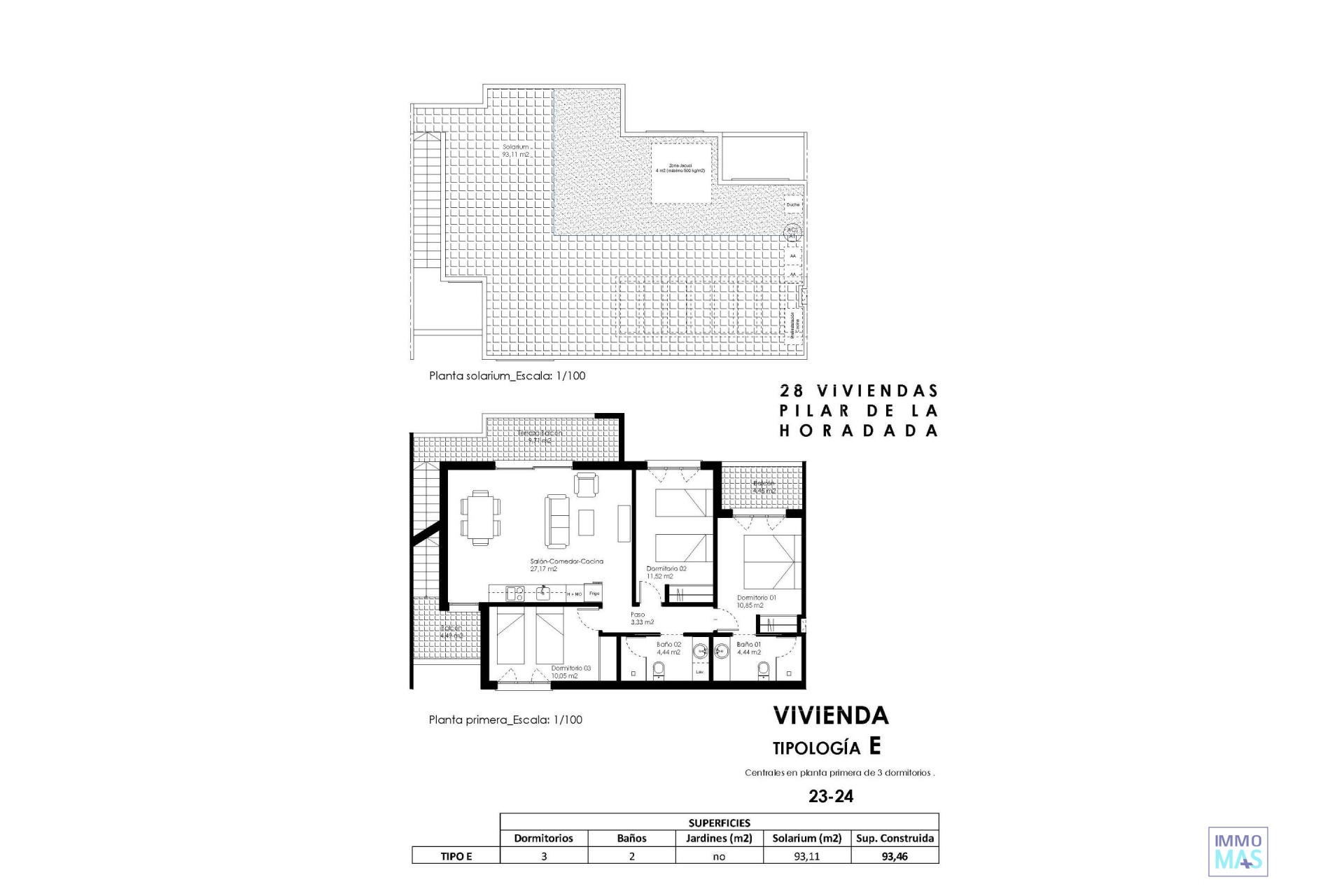 Bungalows neufs avec solarium ou jardin à Pilar de la Horadada Résidence moderne sur la Costa Blanca Sud Situé dans la charmante commune de Pilar de la Horadada, ce nouveau lotissement de bungalows offre un style de vie confortable et méditerranéen dans l'une des zones les plus attrayantes de la Costa Blanca. Pilar de la Horadada est connue pour son ambiance accueillante, son excellent climat et ses longues plages de sable fin telles que Las Higuericas et Mil Palmeras, idéales pour profiter en famille ou pratiquer des sports nautiques. Distribution et types de logements Le complexe se compose de 28 bungalows modernes disponibles en versions 2 et 3 chambres, répartis comme suit : Rez-de-chaussée avec jardin privé Étages supérieurs avec solarium privé et débarras attribué La plupart des logements sont orientés au sud, ce qui garantit une excellente luminosité, et offrent une vue sur la piscine communautaire ou le parc adjacent. Espaces fonctionnels et bien équipés Chaque logement a été conçu avec des espaces spacieux et fonctionnels : Cuisine américaine intégrée avec grand salon-salle à manger Armoires encastrées Terrasse privée dans chaque unité Place de parking incluse De plus, les logements disposent de : Eau chaude par système aérothermique Pré-installation de la climatisation Menuiserie extérieure en PVC avec double vitrage et volets en aluminium Meubles de salle de bains inclus Espaces communs et environnement naturel Le complexe résidentiel comprend une piscine communautaire entourée d'espaces verts, parfaite pour profiter du soleil et de la tranquillité. À seulement 4 km de la plage de Las Higuericas, vous pouvez facilement vous y rendre à pied ou à vélo en empruntant l'agréable promenade qui mène à la mer. Excellent emplacement et connectivité L'emplacement du lotissement permet d'accéder à tous types de services et de points d'intérêt : Supermarchés, magasins, bars et restaurants à moins d'1 km Terrains de golf tels que Lo Romero à 6 km Centre commercial Dos Mares à 11 km Plages de Mil Palmeras et Torre de la Horadada à seulement 5 minutes Aéroport de Murcie (Corvera) à 40 km Aéroport d'Alicante à 65 km Votre nouvelle vie au soleil Ce lotissement à Pilar de la Horadada représente une excellente opportunité de profiter de la vie méditerranéenne dans une maison moderne et bien située. Contactez-nous dès aujourd'hui pour plus d'informations ou pour organiser une visite et faire le pas vers votre nouvelle maison sur la Costa Blanca.