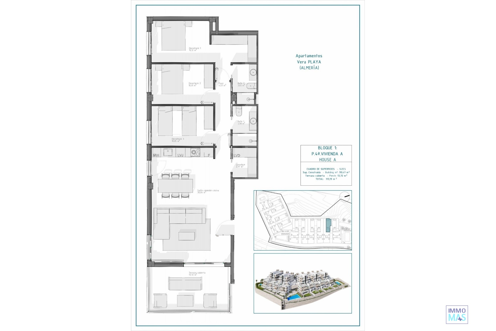 Appartements neufs à Vera Playa, Almería – Maisons modernes près de la mer Une vie contemporaine à Pueblo Salinas, à seulement 2 km de la plage Découvrez un superbe nouveau complexe résidentiel situé dans le quartier très prisé de Vera Playa, au sein de l'urbanisation exclusive de Pueblo Salinas. Ce complexe moderne offre un style de vie privilégié à seulement 2 km des plages de Vera (Almería), avec des vues spectaculaires sur la mer et un environnement méditerranéen paisible, idéal pour vivre toute l'année ou passer des vacances agréables. Des maisons élégantes alliant confort et style moderne Ce nouveau projet comprend 60 appartements de haute qualité répartis dans 5 immeubles de faible densité, avec seulement deux propriétés par étage. Choisissez entre des agencements de 2 ou 3 chambres conçus dans un souci de fonctionnalité, de confort et de style. Les options comprennent : Rez-de-chaussée avec jardins privés Appartements intermédiaires avec terrasses spacieuses Penthouses au dernier étage avec grands solariums comprenant une cuisine d'été et une pergola avec panneaux solaires. Toutes les propriétés disposent de : Cuisines ouvertes entièrement équipées avec réfrigérateur intégré, lave-vaisselle, plaque à induction, four, micro-ondes et hotte aspirante Espaces de vie lumineux et éclairage LED dans toute la maison (sauf dans les chambres) Volets motorisés en aluminium dans les chambres Salles de bains aux finitions modernes, avec sèche-serviettes, receveurs de douche avec parois en verre et meubles encastrés Pré-installation de la climatisation gainable Système aérothermique pour une production efficace d'eau chaude Porte d'entrée sécurisée Des équipements collectifs exceptionnels Les résidents bénéficieront d'un accès à un large éventail d'équipements conçus pour améliorer leur confort et leurs loisirs, notamment : Deux piscines extérieures idéales pour les mois d'été Une piscine intérieure chauffée pour une utilisation toute l'année Une place de parking privée et un espace de rangement inclus avec chaque propriété Pré-installation pour la recharge de véhicules électriques dans les parkings Emplacement privilégié avec d'excellentes connexions Vera Playa est une destination côtière très prisée, connue pour ses larges plages de sable et son style de vie décontracté. L'emplacement du complexe offre un accès facile aux services et attractions essentiels : Plage : 2 km Desert Springs Golf Resort : 8 km Centre-ville de Vera : 5 km Port de plaisance et restaurants de Garrucha : 6 km Parque Comercial Mojácar : 10 km Aéroport d'Almería : 85 km (1 heure en voiture) Faites de Vera Playa votre nouveau chez-vous Que vous recherchiez une résidence permanente, une maison de vacances ou un investissement intelligent, ces appartements neufs offrent un rapport qualité-prix inégalé dans l'une des zones les plus prisées de la Costa de Almería. Contactez-nous dès aujourd'hui pour obtenir plus d'informations et planifier votre visite.