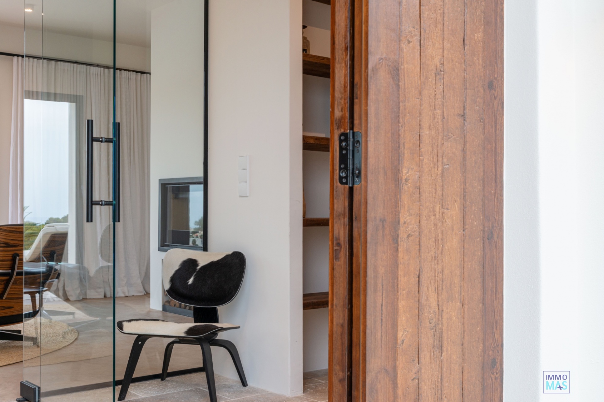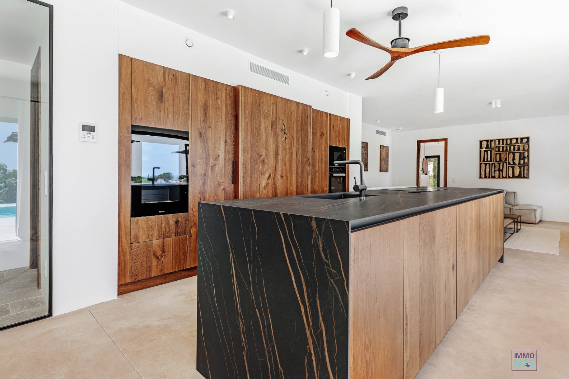 À l'intérieur, vous êtes accueilli dans un hall d'entrée spacieux menant à un salon lumineux avec un coin salon moderne, une cheminée confortable et un agencement ouvert. La cuisine design est entièrement sur mesure et équipée d'appareils électroménagers Miele haut de gamme, notamment :