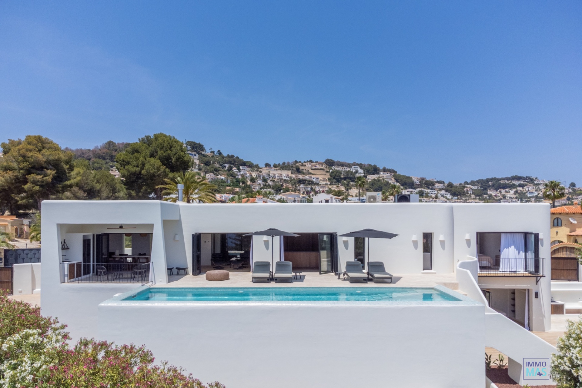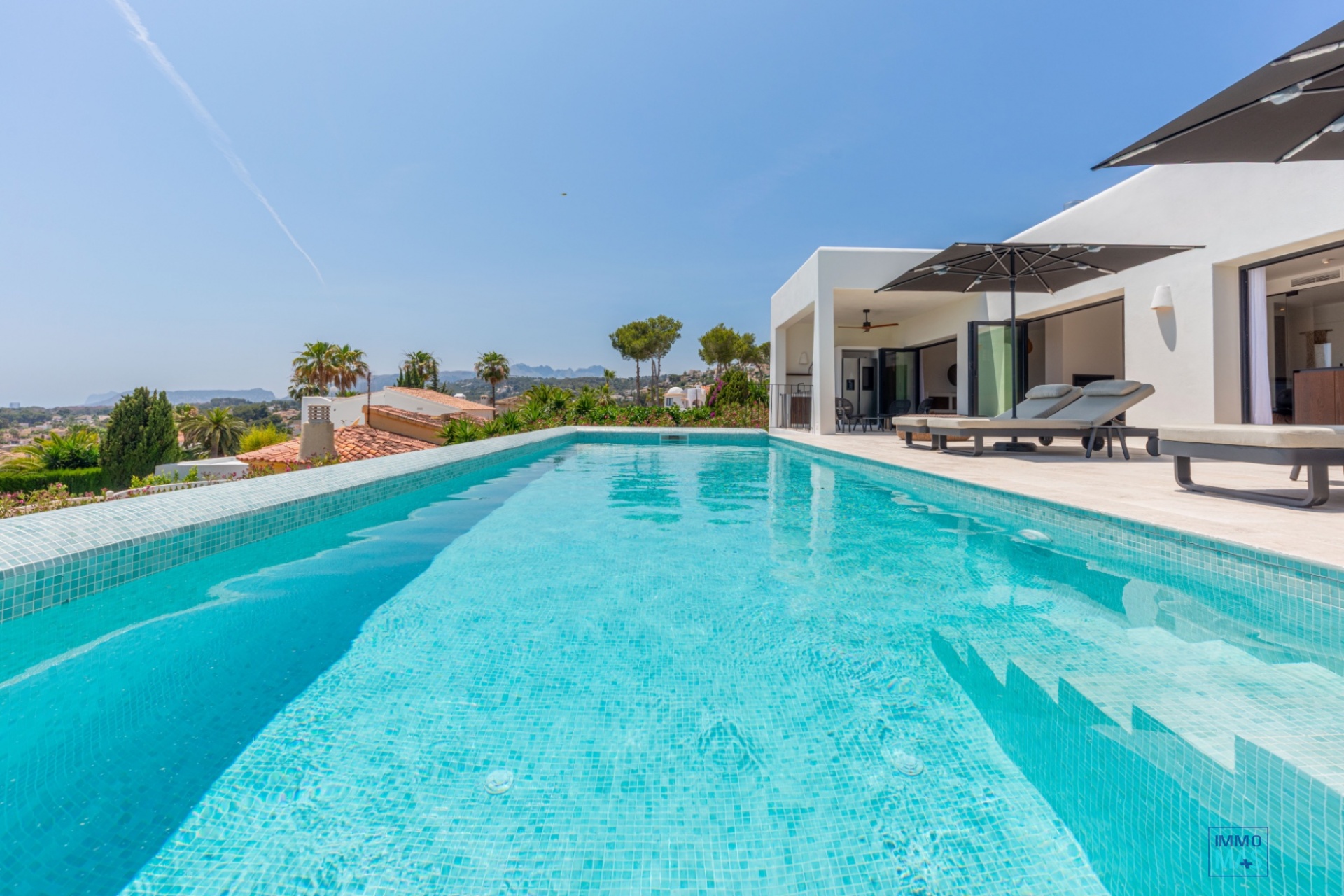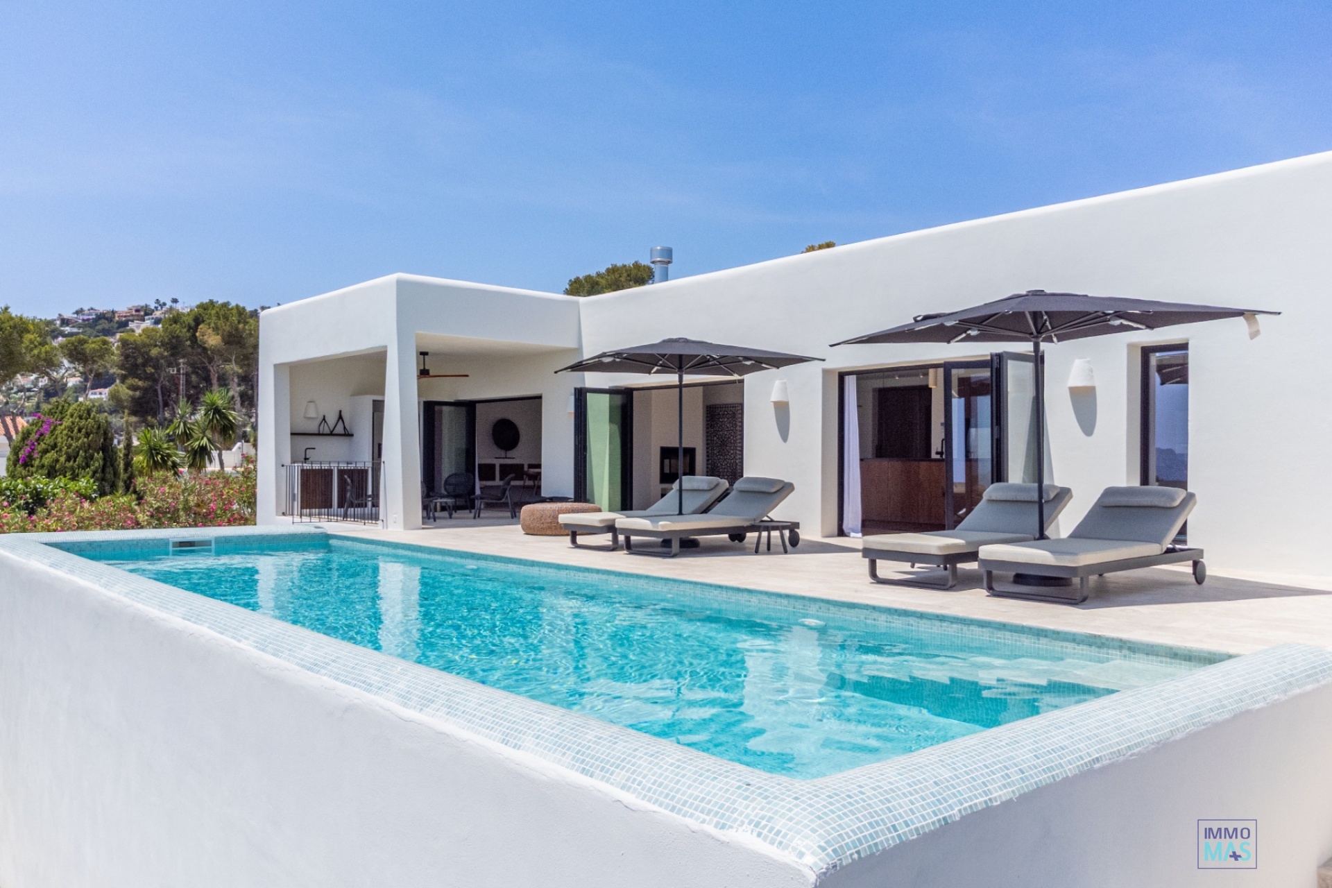 Les grandes baies vitrées coulissantes en aluminium Reynaers offrent une expérience parfaite entre intérieur et extérieur et s'ouvrent sur la terrasse orientée au sud avec piscine privée, chaises longues et vue imprenable sur la mer - un véritable paradis pour les bons vivants.