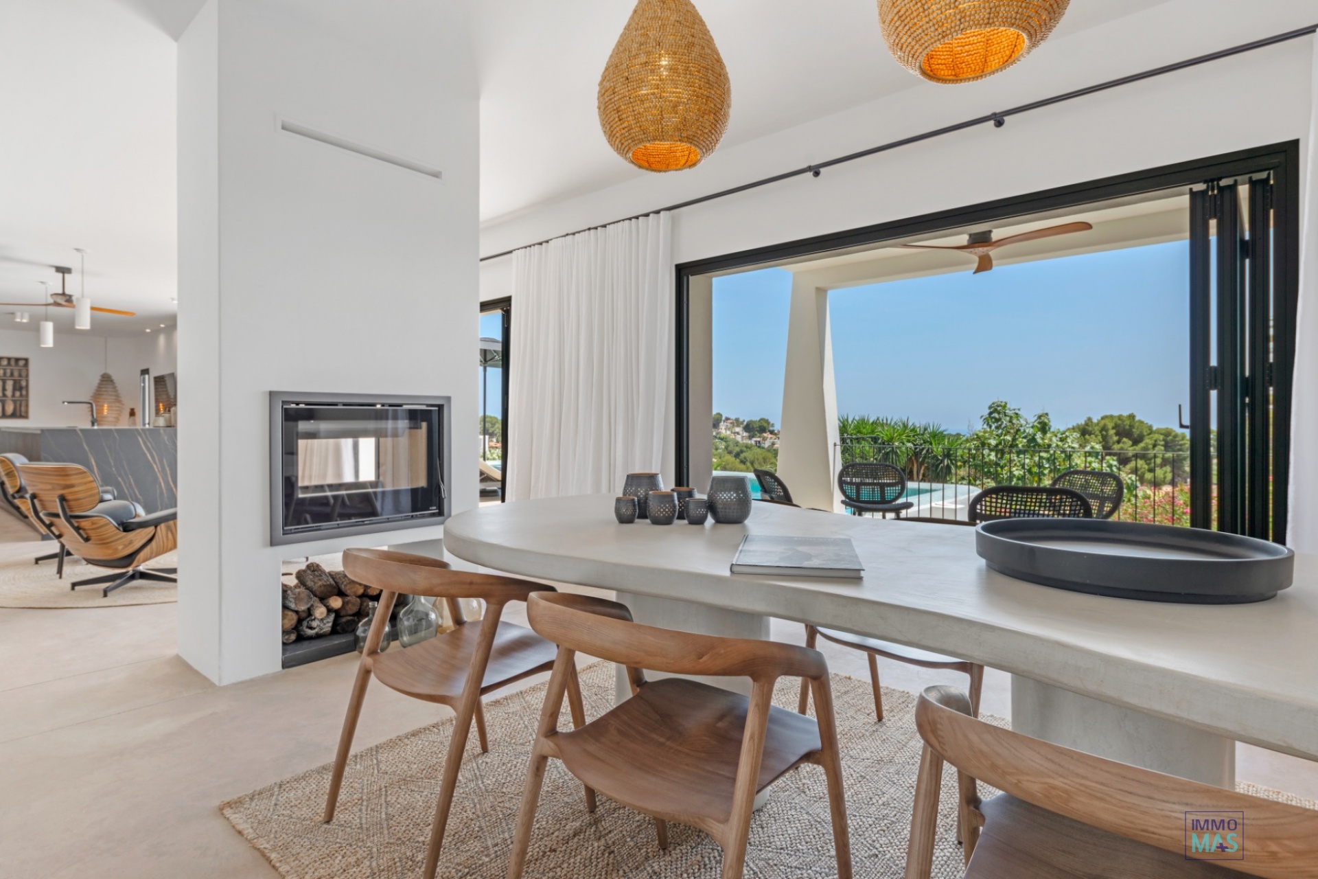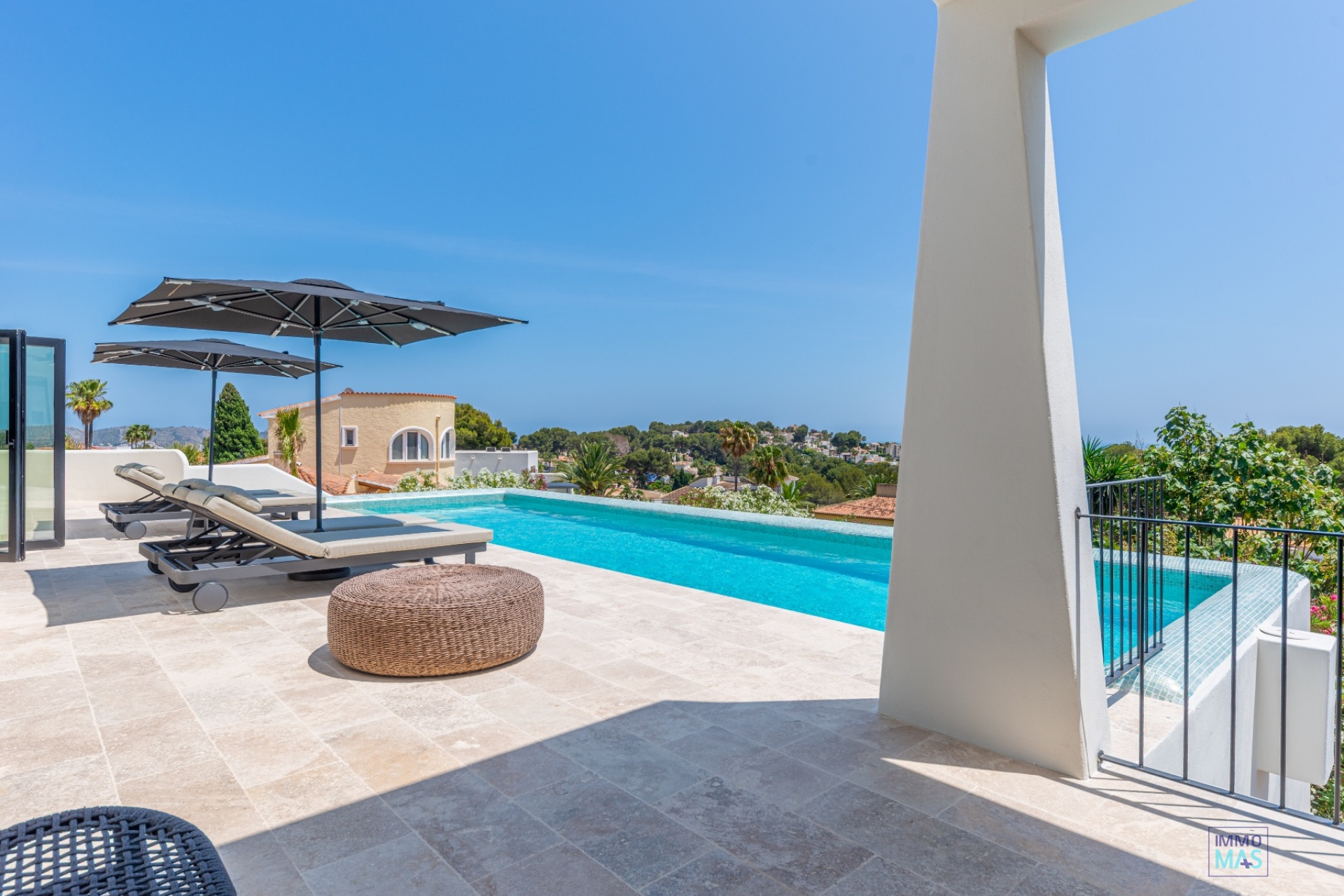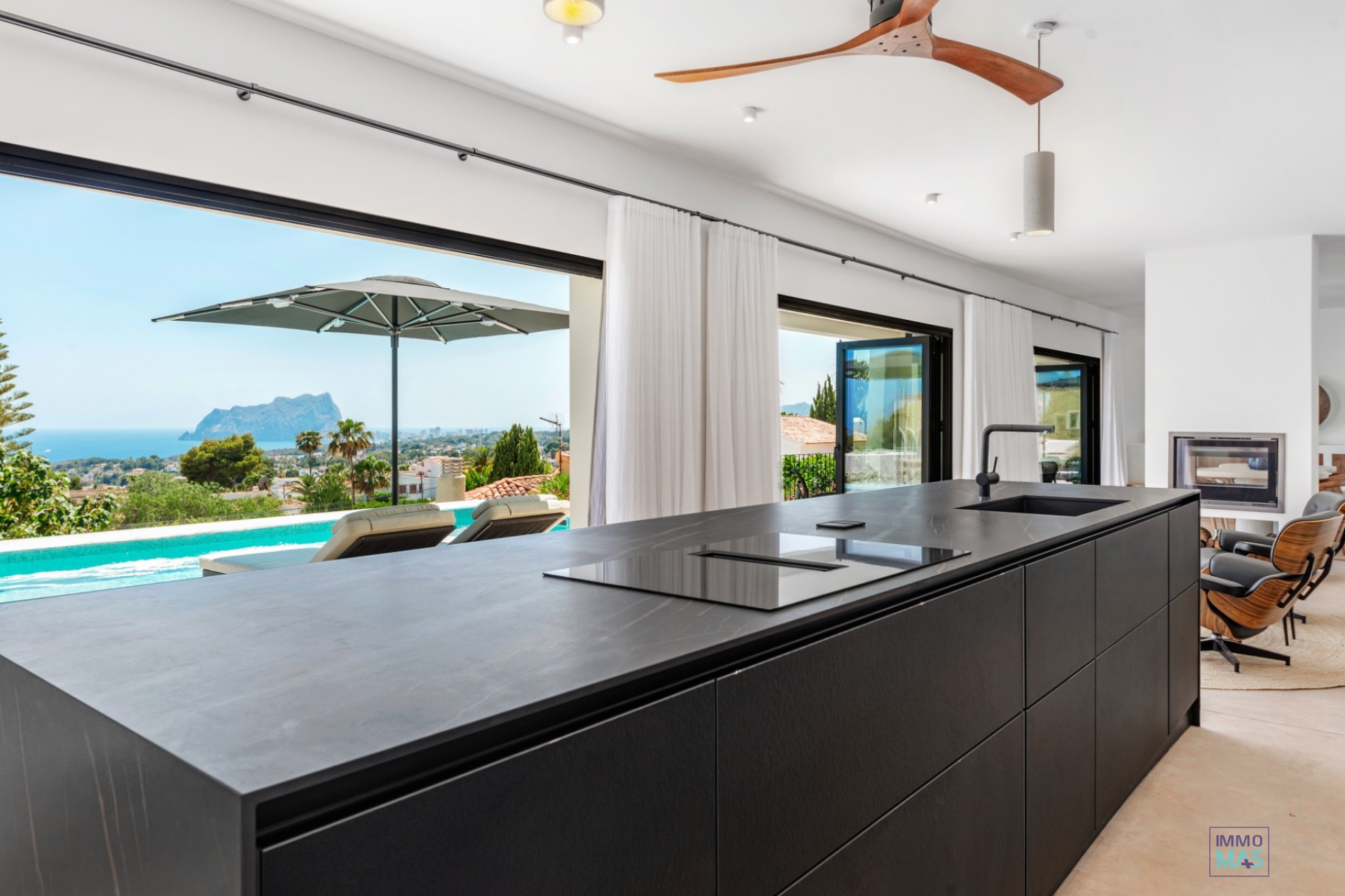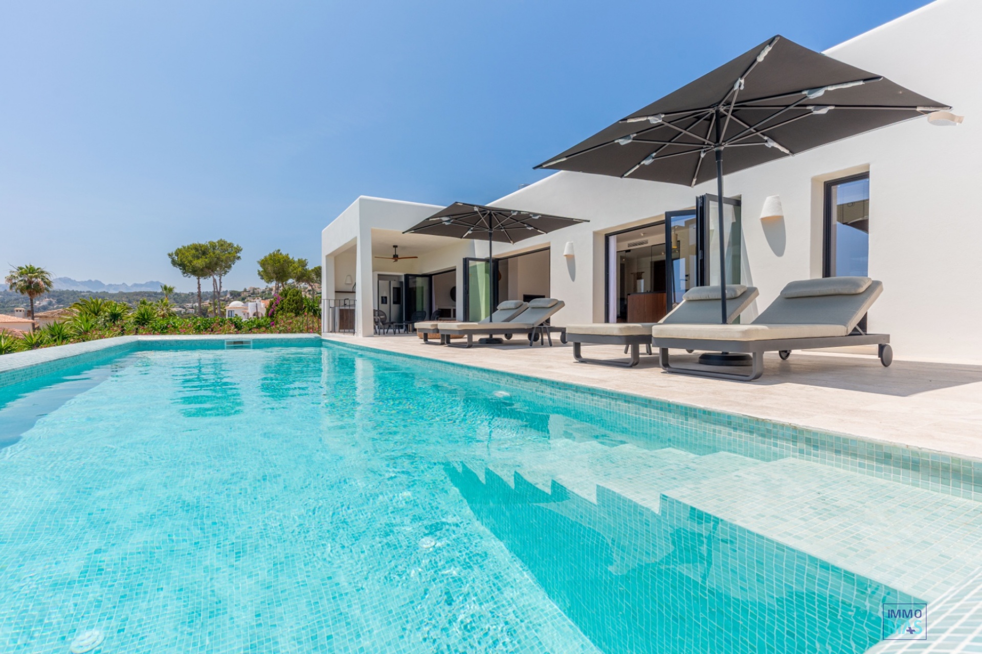 Les grandes baies vitrées coulissantes en aluminium Reynaers offrent une expérience parfaite entre intérieur et extérieur et s'ouvrent sur la terrasse orientée au sud avec piscine privée, chaises longues et vue imprenable sur la mer - un véritable paradis pour les bons vivants.