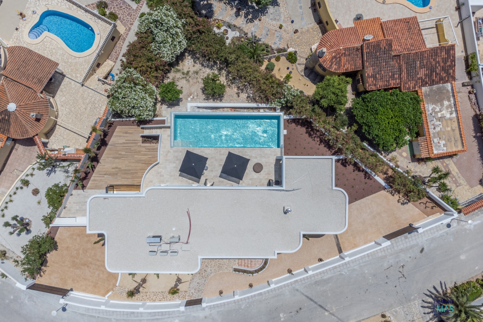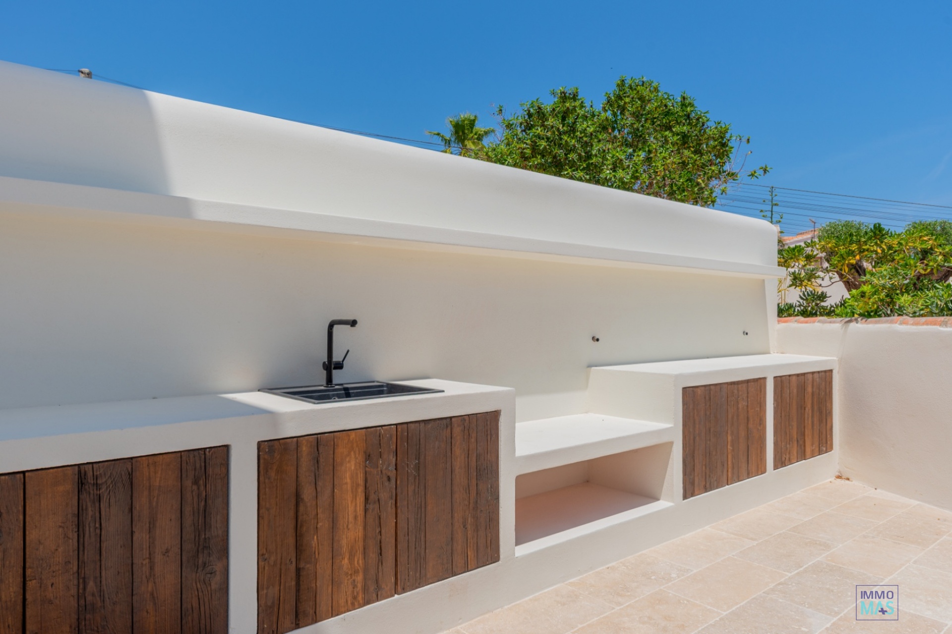 Le salon extérieur est équipé d'un réfrigérateur américain (avec machine à glaçons), d'un évier et d'une cuisine extérieure, idéal pour les douces soirées d'été. Le jardin méditerranéen est aménagé avec goût, avec des palmiers, des plantations matures et un système d'irrigation entièrement automatique.