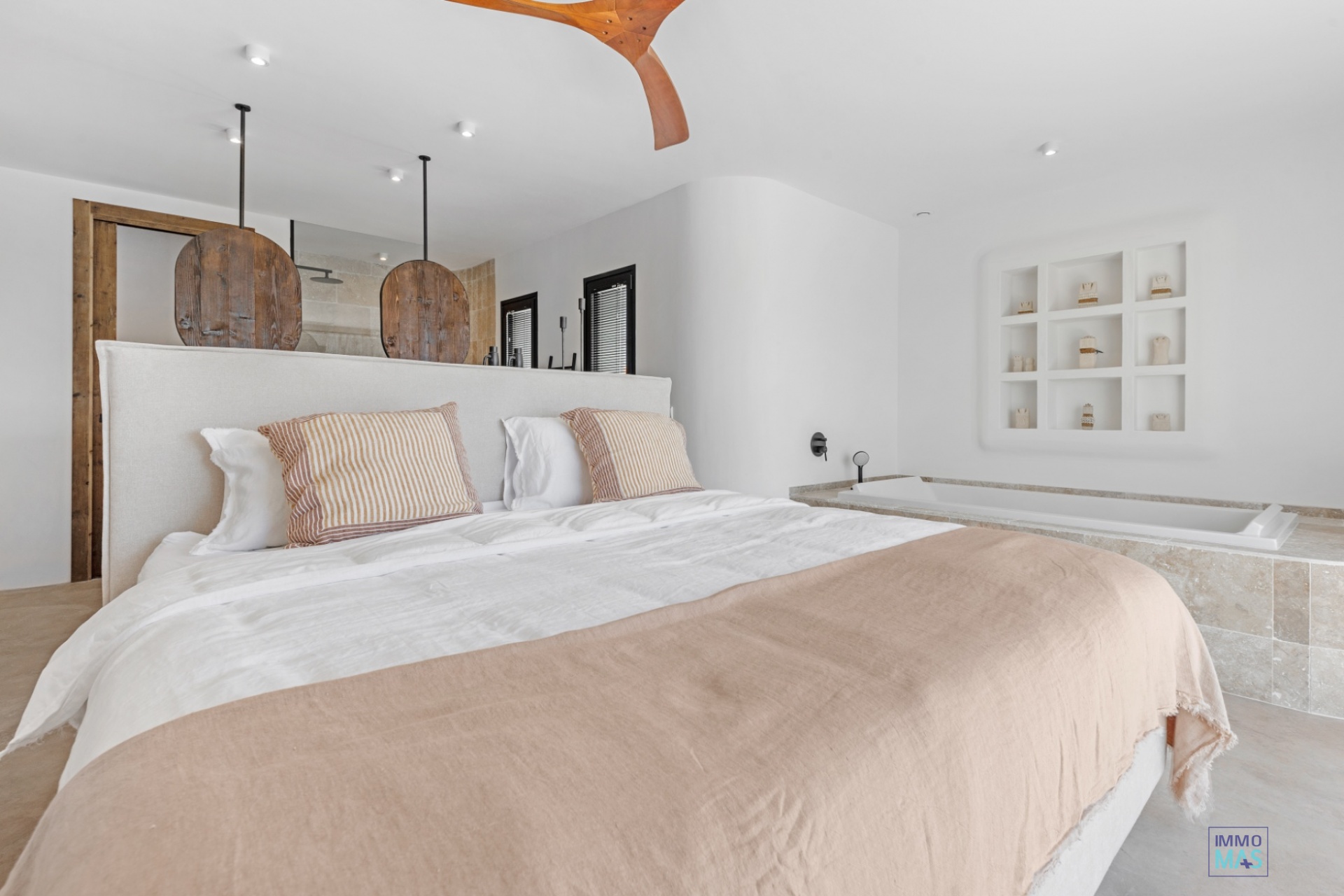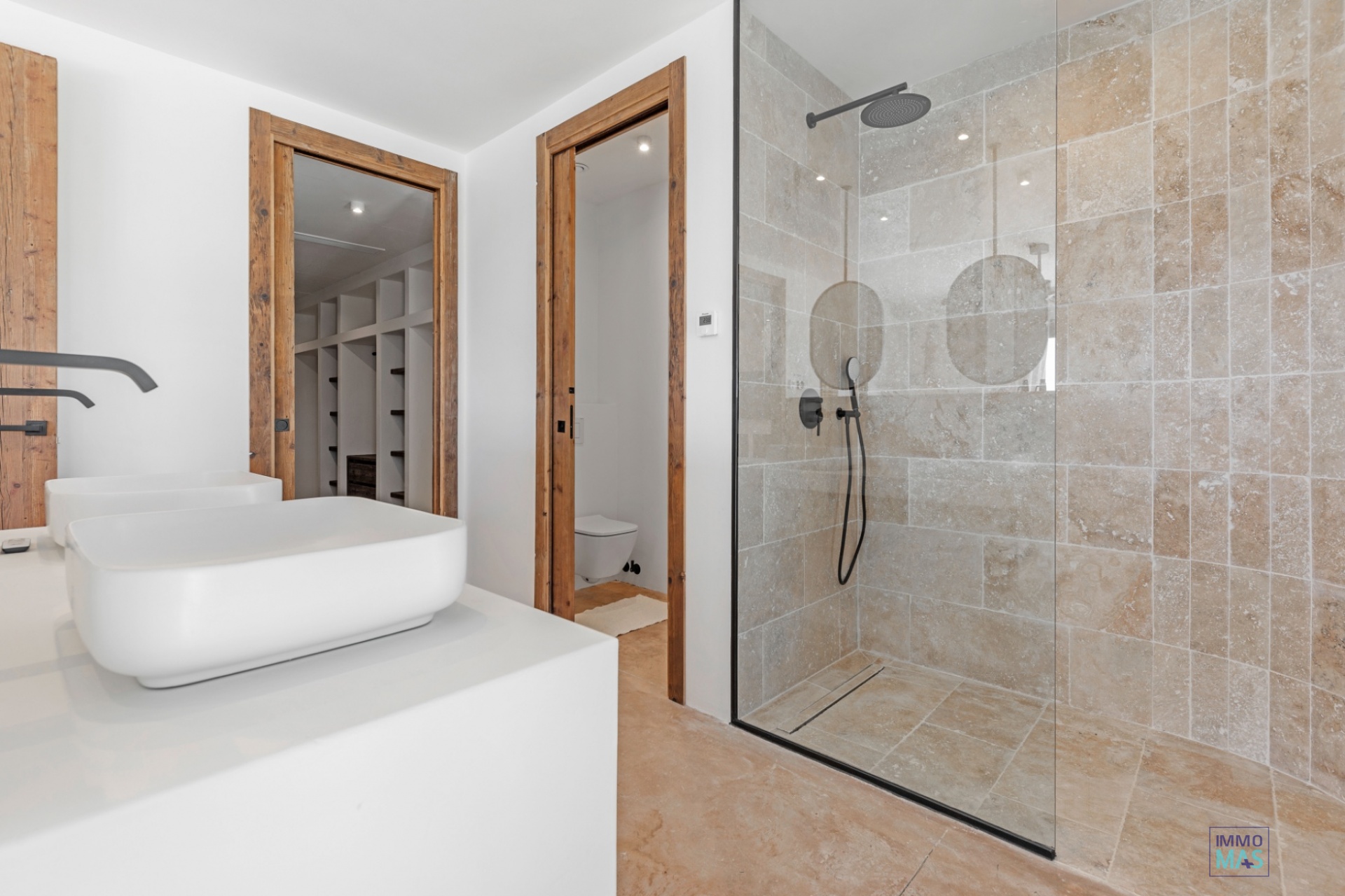 La chambre principale spacieuse au rez-de-chaussée offre un accès direct à la terrasse et dispose d'une salle de bains luxueuse avec baignoire, douche à l'italienne et un dressing exclusif sur mesure en bois Movingui traité thermiquement (classe de durabilité 1). Ce bois élégant a été utilisé dans toute la maison et souligne la finition de haute qualité.