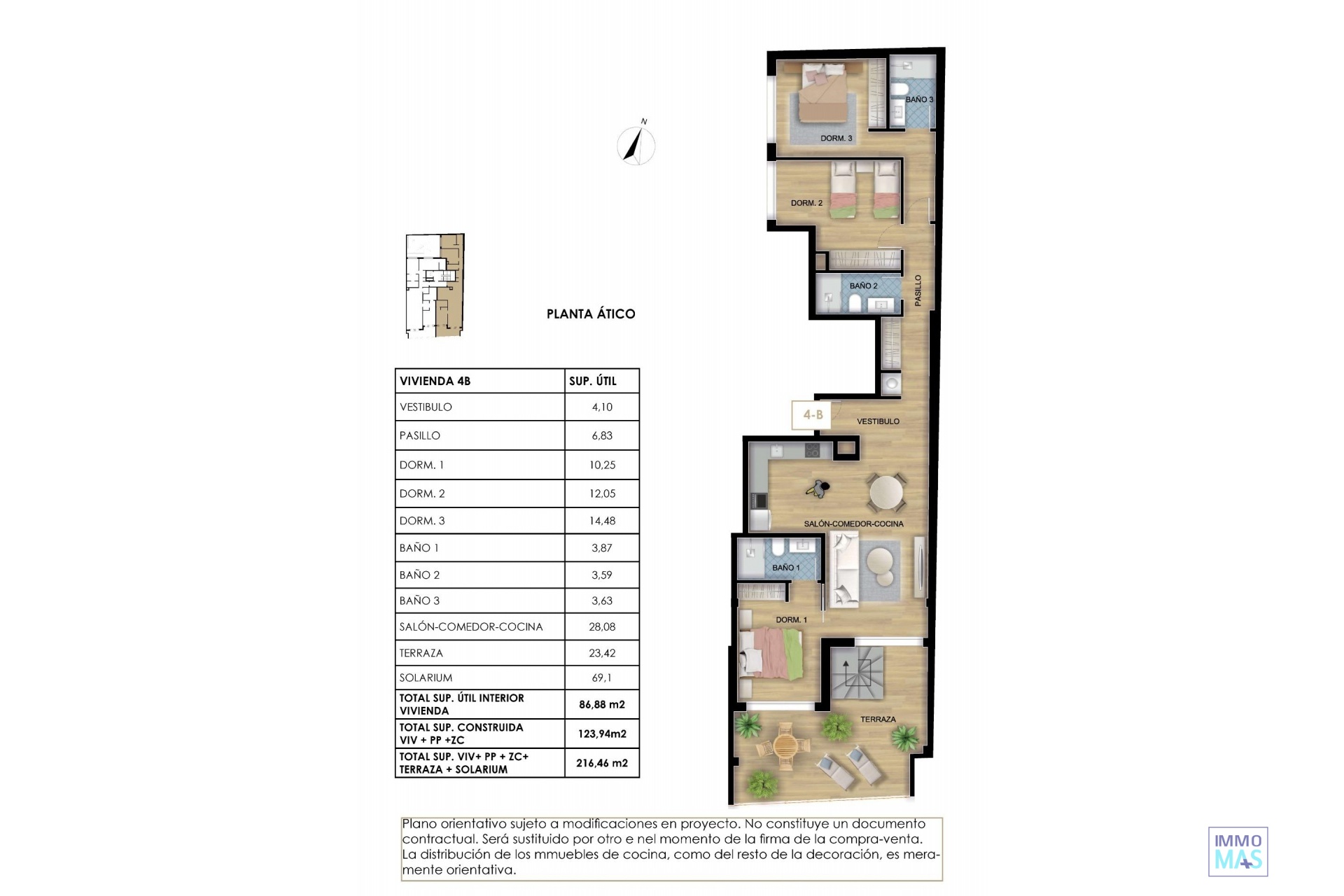 NOUVEAUX PENTHOUSES À TORREVIEJA PRÈS DE LA PLAGE Nouvelle construction de 8 appartements de luxe et penthouses à Torrevieja situé à seulement 150 mètres de la plage. Les propriétés modernes ont 3 chambres à coucher, 3 salles de bains, une cuisine ouverte sur le salon, des salles de bains chauffées, des terrasses spacieuses, des armoires et des cuisines entièrement équipées. Penthouses avec solariums privés. Piscine communautaire et sauna, solarium sur le toit avec barbecue. Un parking souterrain est disponible en option moyennant un supplément. Date d'achèvement fin 2025 Torrevieja est une ville espagnole de la province d'Alicante, sur la Costa Blanca. Elle est connue pour son climat typiquement méditerranéen et son littoral. Elle possède des promenades avec des stations balnéaires le long de ses plages de sable. Le petit musée de la mer et du sel présente des expositions sur l'histoire de la pêche et du sel dans la ville. À l'intérieur des terres, le parc naturel Lagunas de La Mata-Torrevieja propose des sentiers et deux lagunes salées, l'une rose et l'autre verte. L'aéroport d'Alicante se trouve à 40 minutes et celui de Murcie à environ 1 heure.