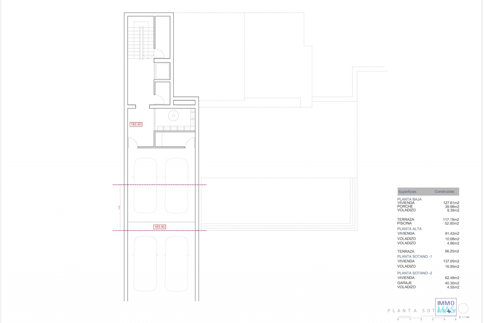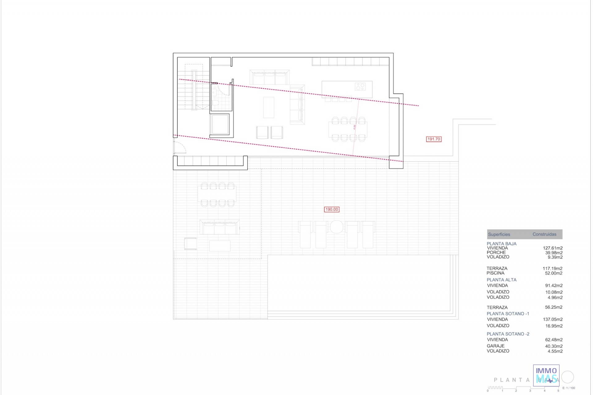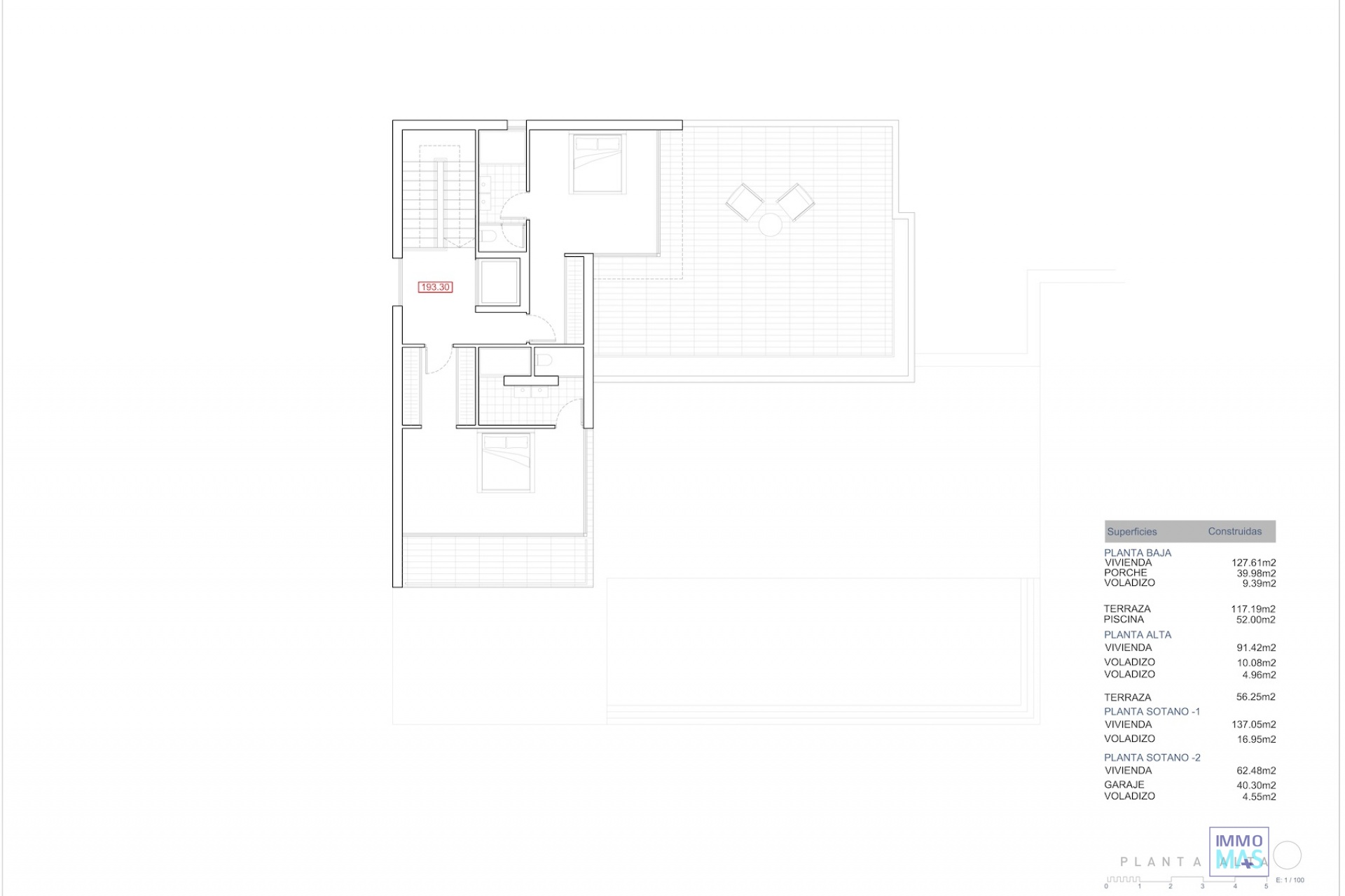 Cette villa, avec des finitions en béton apparente lambrissées, dispose de 4 étages reliés par un ascenseur et un escalier intérieur. Le rez-de-chaussée dispose d’un spacieux salon-salle à manger-cuisine ouverte et d’un WC. La cuisine est entièrement équipée et dispose d’un îlot pour cuisiner. Des portes coulissantes à hauteur de plafond donnent un accès direct à une grande terrasse et à une piscine. L’étage supérieur contient deux chambres avec salle de bains et une terrasse.