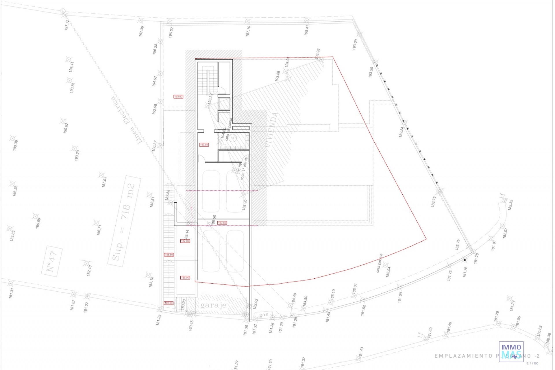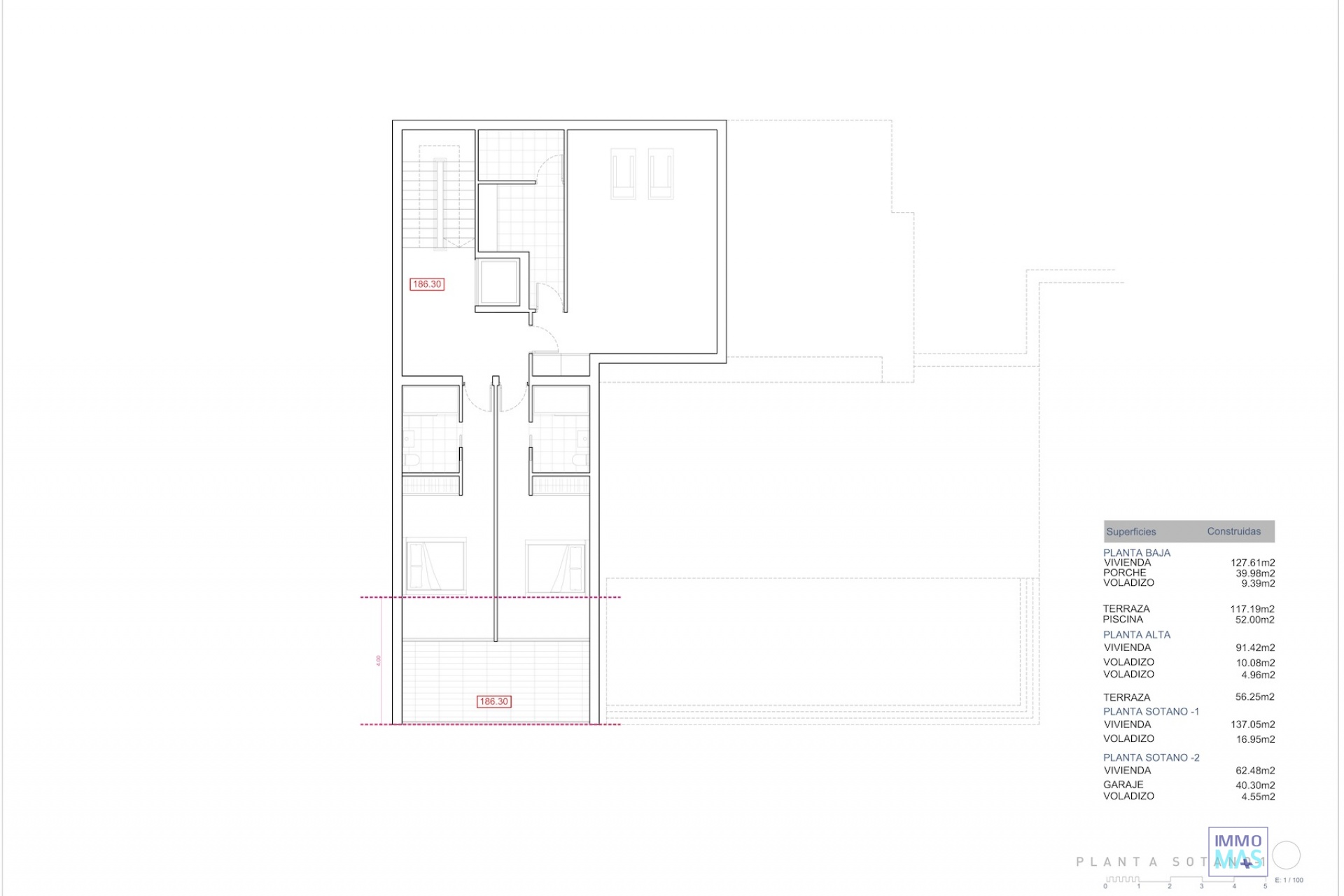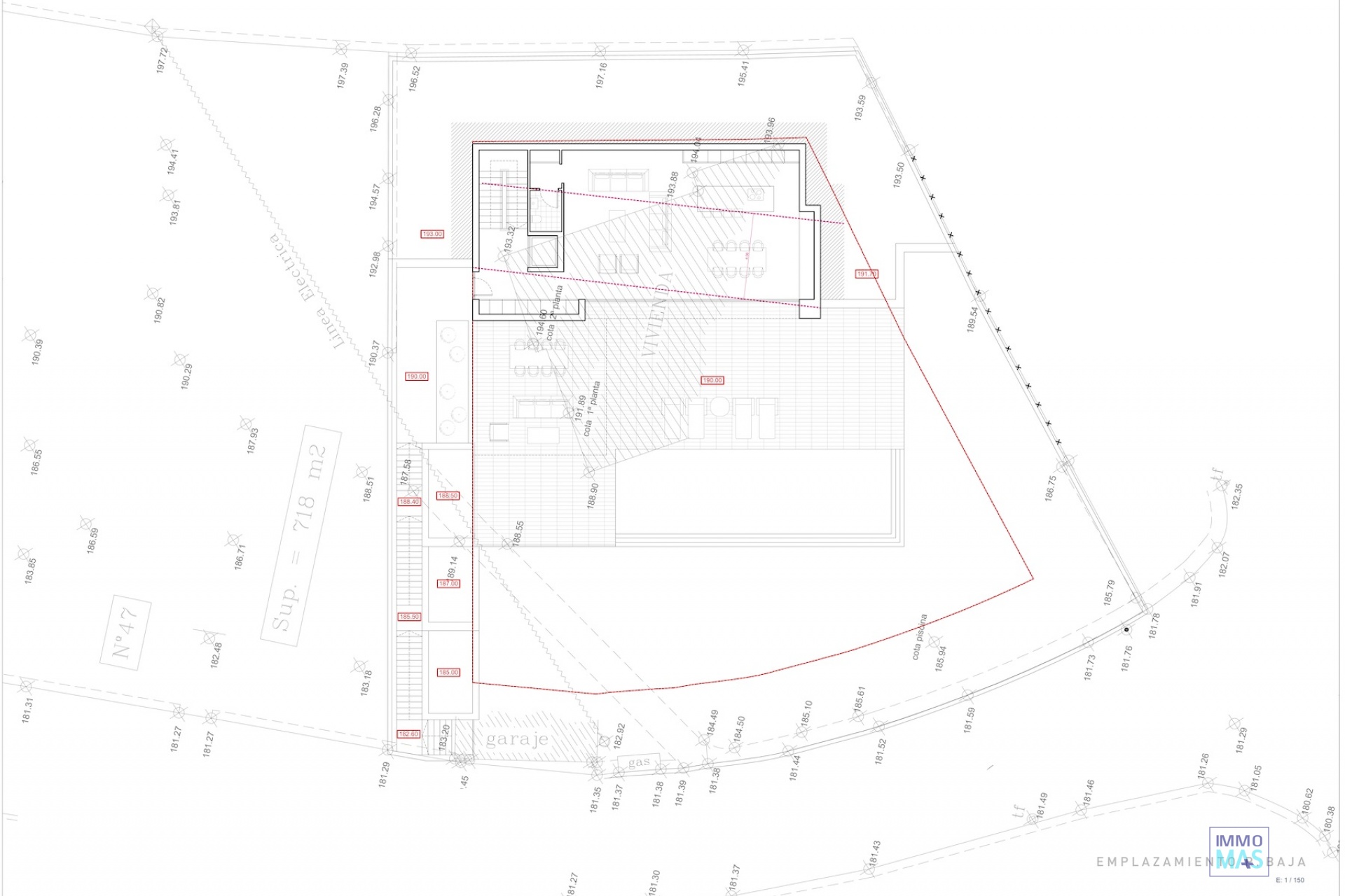 Cette villa, avec des finitions en béton apparente lambrissées, dispose de 4 étages reliés par un ascenseur et un escalier intérieur. Le rez-de-chaussée dispose d’un spacieux salon-salle à manger-cuisine ouverte et d’un WC. La cuisine est entièrement équipée et dispose d’un îlot pour cuisiner. Des portes coulissantes à hauteur de plafond donnent un accès direct à une grande terrasse et à une piscine. L’étage supérieur contient deux chambres avec salle de bains et une terrasse.