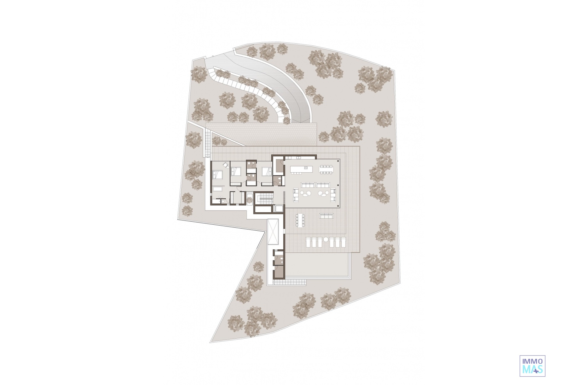Cette villa spectaculaire articule les espaces intérieurs à travers des géométries simples, pures et retentissantes. On y accède par une rampe et un escalier intégrés au terrain, soutenant la partie supérieure de la maison sur un socle en pierre qui donne accès à la maison. Au rez-de-chaussée il y a le garage, un hall d’accès généreux à côté d’une grande cave et les espaces de couchage et de gym. Des espaces qui restent ouverts et encadrés par un cadre géométrique pur qui entoure de beaux visuels sur l’environnement. Déjà à l’étage supérieur se trouvent les chambres principales de la maison, toutes avec salle de bains privative et un grand espace ouvert de plus de 90m2 pour abriter un espace fluide de cuisine salle à manger et salon dans un panoramique 180º sur le paysage. Tout cet espace est entouré d’une terrasse spacieuse, à l’avant de laquelle tombe un porche ouvert de plus de 50m2, projetant l’intérieur de la maison vers l’extérieur et la transformant en un espace unique. Une pièce géométrique unique qui offre des visuels impressionnants sur le paysage et a un programme intérieur pratique et soigné et une fonctionnalité.