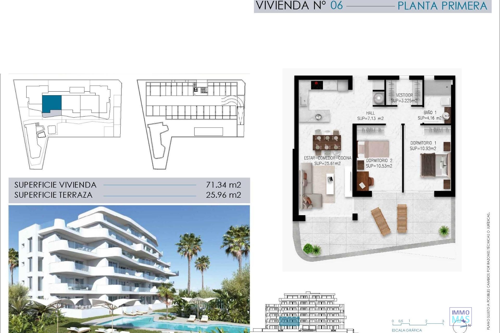 Promotion exclusive de 24 appartements touristiques à 200 m de la mer – La Torre/Urbanisation Mil Palmeras Nouvelle urbanisation boutique exclusive de 24 appartements touristiques de luxe, située dans un emplacement privilégié de la Costa Blanca Sud, dans l'urbanisation consolidée Mil Palmeras, appartenant à la commune de Pilar de la Horadada (Alicante). Ce projet est développé en deuxième ligne de mer, à seulement 200 mètres, à côté de l'une des meilleures plages de la région, dans une zone résidentielle et touristique très prisée pour sa qualité de vie, son environnement naturel et son offre complète de loisirs. Les environs comptent des bars de plage, des restaurants, des zones sportives, des promenades maritimes et de vastes espaces verts, ce qui fait de cet emplacement l'un des plus attractifs du littoral méditerranéen. Les appartements, conçus dans un style contemporain et fonctionnel, offrent des finitions de haute qualité, de grandes terrasses avec vue sur la mer et des espaces intérieurs pensés pour le confort, le plaisir et la rentabilité touristique. Le lotissement comprendra des espaces communs paysagers complets, une piscine communautaire, une réception et un salon, offrant des espaces idéaux pour la détente, la convivialité et le bien-être. Logements de 2 chambres, 1 salle de bain, dressing, salon-salle à manger avec cuisine intégrée et grandes terrasses avec vue sur la mer. Une place de parking et un débarras sont inclus pour chaque logement. Les logements sont livrés meublés, avec appareils électroménagers et climatisation par conduits entièrement installée. Emplacement privilégié à Mil Palmeras Situé entre Campoamor et Torre de la Horadada, ce lotissement offre un accès facile aux services locaux, aux écoles, aux restaurants et aux installations sportives ouvertes toute l'année. Mil Palmeras est connue pour sa charmante place du village et sa « rue des restaurants » animée, qui propose une cuisine internationale variée. Pour les amoureux de la nature, le parc naturel de Lo Monte, une réserve ornithologique protégée, et le parc naturel de Río Seco offrent des endroits parfaits pour faire de la randonnée et se détendre. Proximité des principaux points d'intérêt Aéroport international de Murcie : 40 km (environ 45 minutes). Aéroport d'Alicante : 75 km (environ 45 minutes). Terrains de golf les plus proches : à moins de 10 km. Centres commerciaux : à 8 km de Zenia Boulevard. Ports de plaisance : à 5 km de Torre de la Horadada. La maison de vos rêves vous attend Ne manquez pas l'occasion d'acquérir une propriété dans ce complexe résidentiel exceptionnel. Si vous recherchez une maison de vacances avec un potentiel de rentabilité, cette urbanisation à Mil Palmeras a tout pour vous. Contactez-nous dès aujourd'hui pour obtenir plus d'informations ou pour organiser une visite.