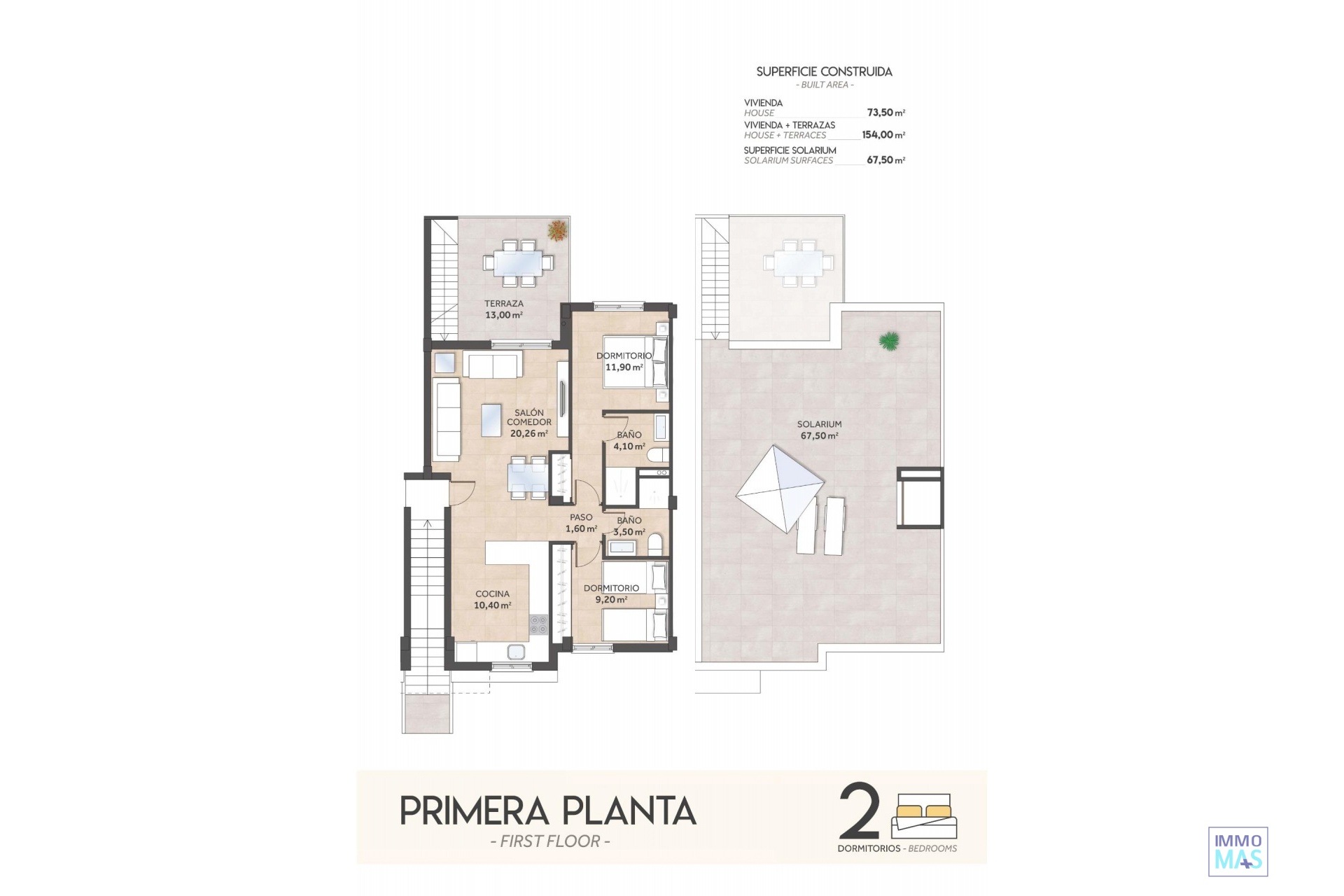 Bungalows neufs à San Miguel de Salinas – Nature, golf et confort Découvrez ce nouveau lotissement résidentiel à San Miguel de Salinas, situé dans le quartier très prisé de « La Cañada », entouré d'une pinède protégée entre les prestigieux terrains de golf de Campoamor et Las Colinas. À seulement 7 km de la côte méditerranéenne, ce lotissement offre un mélange parfait entre tranquillité, nature et accès facile à toutes les commodités. Maisons spacieuses et modernes Le lotissement propose deux types de propriétés adaptées à différents styles de vie : Bungalows au rez-de-chaussée : 2 chambres, 2 salles de bains, deux grands jardins privés et un parking en surface. Bungalows au dernier étage : 2 chambres, 2 salles de bains, un grand solarium avec vue sur la mer et un parking en surface. Chaque maison est très spacieuse et peut être transformée en une maison de 3 chambres (en option, moyennant un supplément), avec des appareils électroménagers inclus. Finitions de haute qualité Conçues pour le confort et la fonctionnalité, toutes les propriétés comprennent : Salles de bains entièrement équipées avec meubles, miroirs et parois de douche Système d'eau chaude aérothermique Plafonniers LED encastrés Espaces communs exclusifs La résidence dispose de plus de 1 700 m² d'espaces verts paysagers avec des palmiers et des plantes méditerranéennes. Les résidents peuvent profiter d'une grande piscine avec jacuzzi, d'un bassin pour enfants et d'espaces pour prendre le soleil, ce qui en fait le cadre idéal pour profiter du climat de la Costa Blanca tout au long de l'année. Emplacement privilégié à San Miguel de Salinas Ce quartier résidentiel calme est situé à moins de 3 km de la charmante ville de San Miguel de Salinas, avec tous les services quotidiens à portée de main. De plus, les belles plages de sable d'Orihuela Costa et de Torrevieja ne sont qu'à 7 km, offrant d'innombrables possibilités de loisirs, de shopping et de restauration. À proximité de terrains de golf renommés Pour les amateurs de golf, l'emplacement est imbattable. Dans un rayon de 4 km, vous trouverez trois des terrains de golf les plus prestigieux de la Costa Blanca : Villamartín Golf – 3,5 km Las Colinas Golf & Country Club – 4 km Campoamor Golf – 4 km Excellente connectivité Les principaux points d'intérêt à proximité sont les suivants : San Miguel de Salinas – 3 km Centre commercial La Zenia Boulevard – 10 km Aéroport d'Alicante – 55 km Aéroport de Murcie (Corvera) – 50 km Assurez-vous votre nouvelle maison à San Miguel de Salinas Que vous recherchiez une résidence permanente, une maison de vacances ou une opportunité d'investissement, ces bungalows neufs offrent un excellent rapport qualité-prix dans l'une des zones les plus prisées de la Costa Blanca. Contactez-nous dès aujourd'hui pour obtenir plus d'informations et organiser une visite.