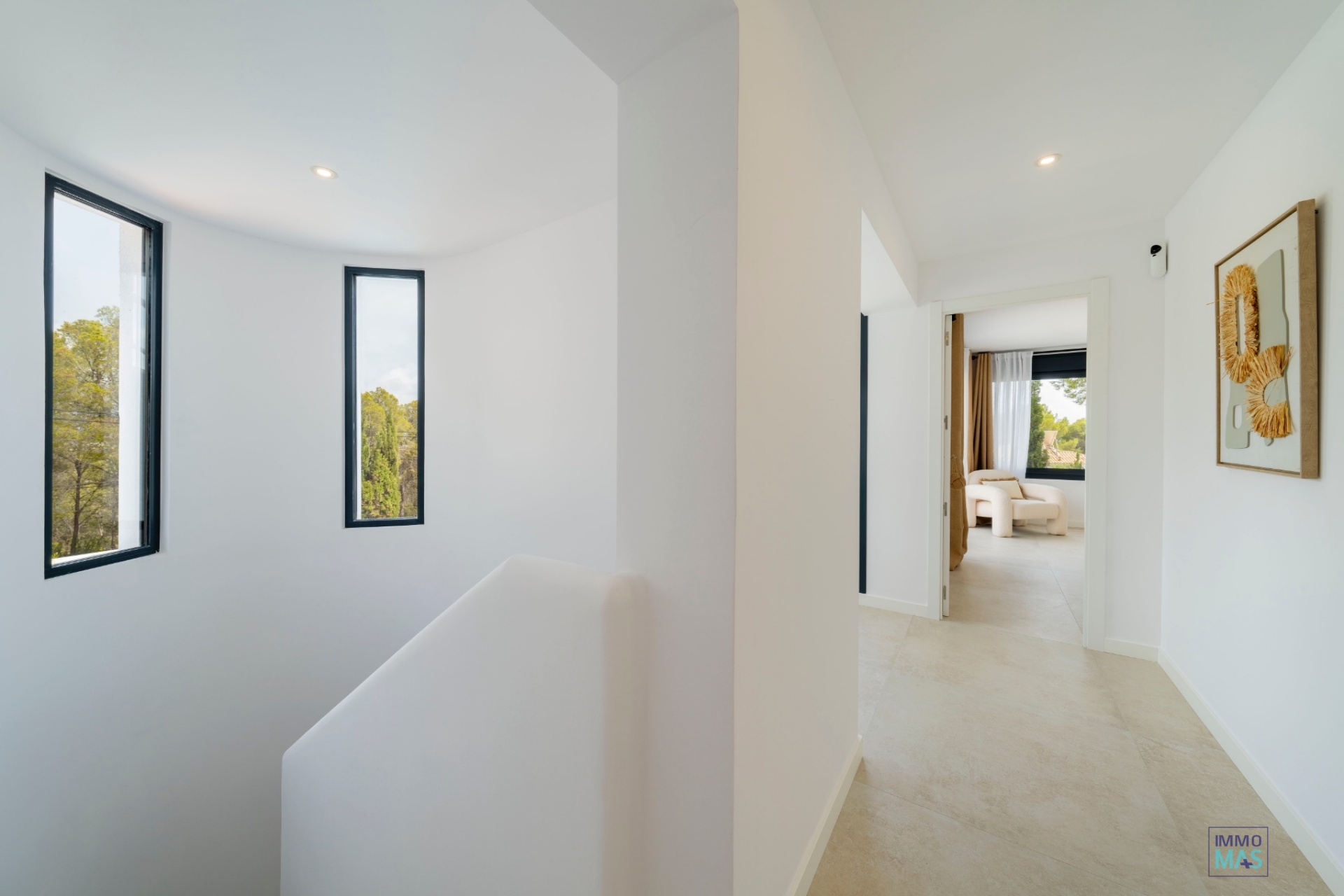 Cette propriété exclusive se distingue par son architecture sculpturale irrégulière et remarquable. Les lignes fluides et les volumes courbes créent un aspect artistique qui s'harmonise parfaitement avec le style méditerranéen. Un élégant escalier sculptural relie harmonieusement tous les étages et ajoute une dimension supplémentaire à l'architecture impressionnante.