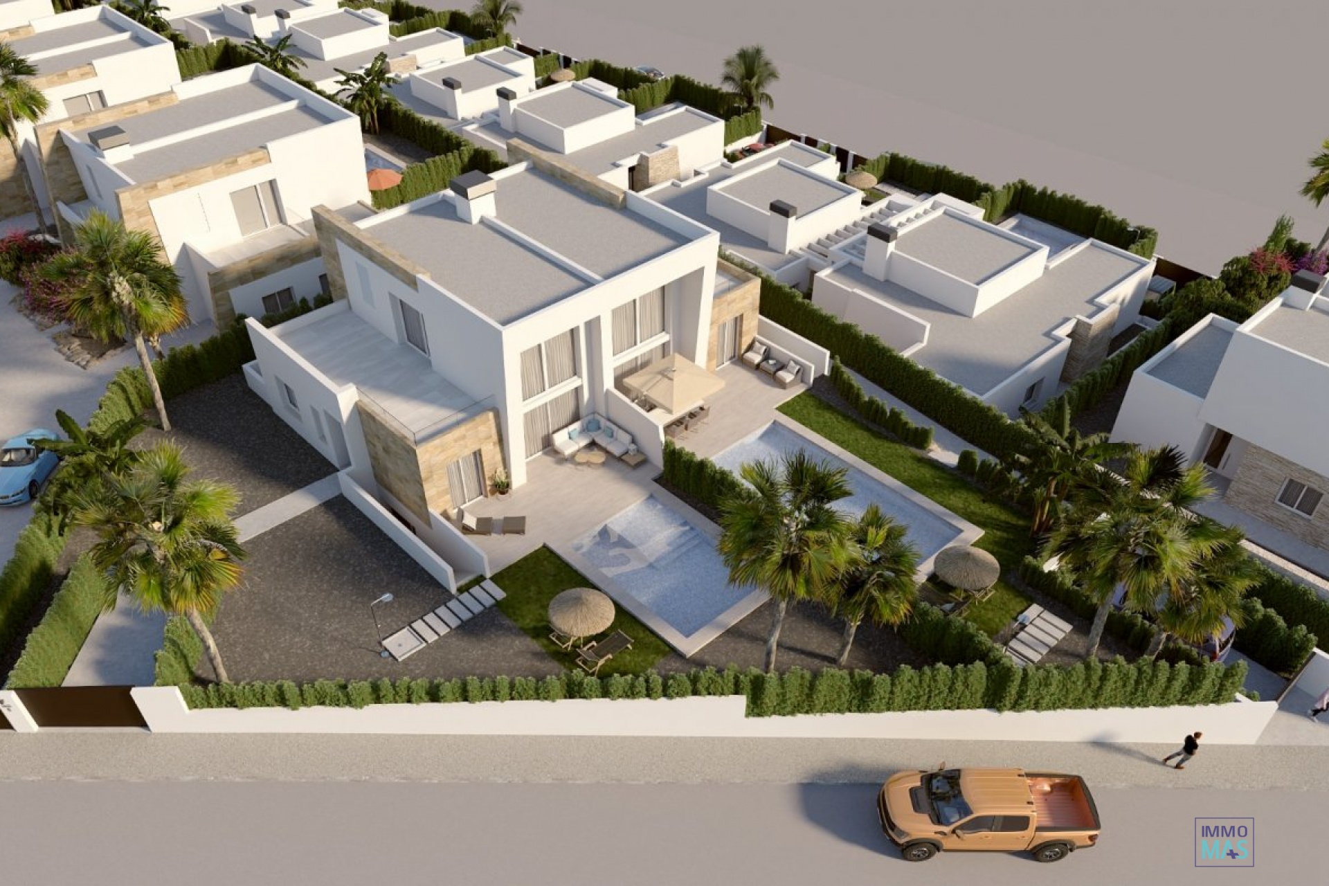 Villas jumelées neuves avec piscine privée dans le complexe La Finca Golf Resort, Algorfa Une vie méditerranéenne exclusive à La Finca Golf Découvrez ce nouveau complexe résidentiel exceptionnel situé dans le prestigieux complexe La Finca Golf Resort à Algorfa, sur la Costa Blanca Sud. Vous pouvez choisir entre des appartements de 2/3 chambres avec piscine commune ou des villas jumelées ou individuelles avec piscine privée. Entourée de fairways luxuriants et de paysages naturels, cette communauté offre un style de vie idyllique dans un environnement paisible et sécurisé. La charmante ville d'Algorfa est connue pour son caractère espagnol traditionnel, son excellente gastronomie et son atmosphère détendue, ce qui en fait une destination idéale pour les maisons de vacances et la vie permanente. Villas jumelées modernes avec piscine privée Ces villas jumelées magnifiquement conçues disposent de 3 chambres et 2 salles de bains, alliant fonctionnalité, confort et style moderne. Détails de l'agencement Rez-de-chaussée Salon et salle à manger lumineux et ouverts, reliés à une cuisine équipée Grandes portes coulissantes donnant directement accès au jardin et à la piscine privée Deux chambres spacieuses avec placards intégrés Une salle de bain complète Parking privé dans la propriété Étage supérieur Studio avec salle de bain, idéal pour un bureau, un salon ou un espace invités Accès à une terrasse privée ouverte de 30 m², parfaite pour prendre le soleil et se détendre Caractéristiques et finitions de haute qualité Construites selon des normes haut de gamme, ces villas offrent un confort contemporain pour vivre toute l'année, notamment Armoires encastrées dans toutes les chambres Volets électriques dans le salon et les chambres Salles de bains entièrement équipées avec miroirs et parois de douche Climatisation centralisée entièrement installée Jardin et piscine privés Emplacement privilégié à proximité des plages, du golf et des services La Finca Golf Resort est l'une des destinations de golf les plus renommées de la Costa Blanca, offrant une large gamme de services tels qu'un hôtel de luxe, des restaurants, un spa et des installations sportives. Le complexe bénéficie d'un accès rapide aux villes, plages et aéroports voisins, offrant commodité et connectivité. Distances vers les points clés La Finca Golf Club : accessible à pied Plages de Guardamar del Segura : 15 km Torrevieja et Orihuela Costa : 15 km Almoradí, Benijófar et Ciudad Quesada : à quelques minutes en voiture Aéroport d'Alicante : 35 km Profitez du meilleur de la vie sur la Costa Blanca Avec leur design moderne, leurs espaces extérieurs privés et leur emplacement privilégié, ces villas sont un excellent choix pour les familles, les investisseurs et les amateurs de golf à la recherche d'un style de vie de qualité dans le sud de l'Espagne. Contactez-nous dès aujourd'hui pour organiser une visite ou recevoir plus d'informations sur ce nouveau projet immobilier exclusif à La Finca Golf Resort, Algorfa.