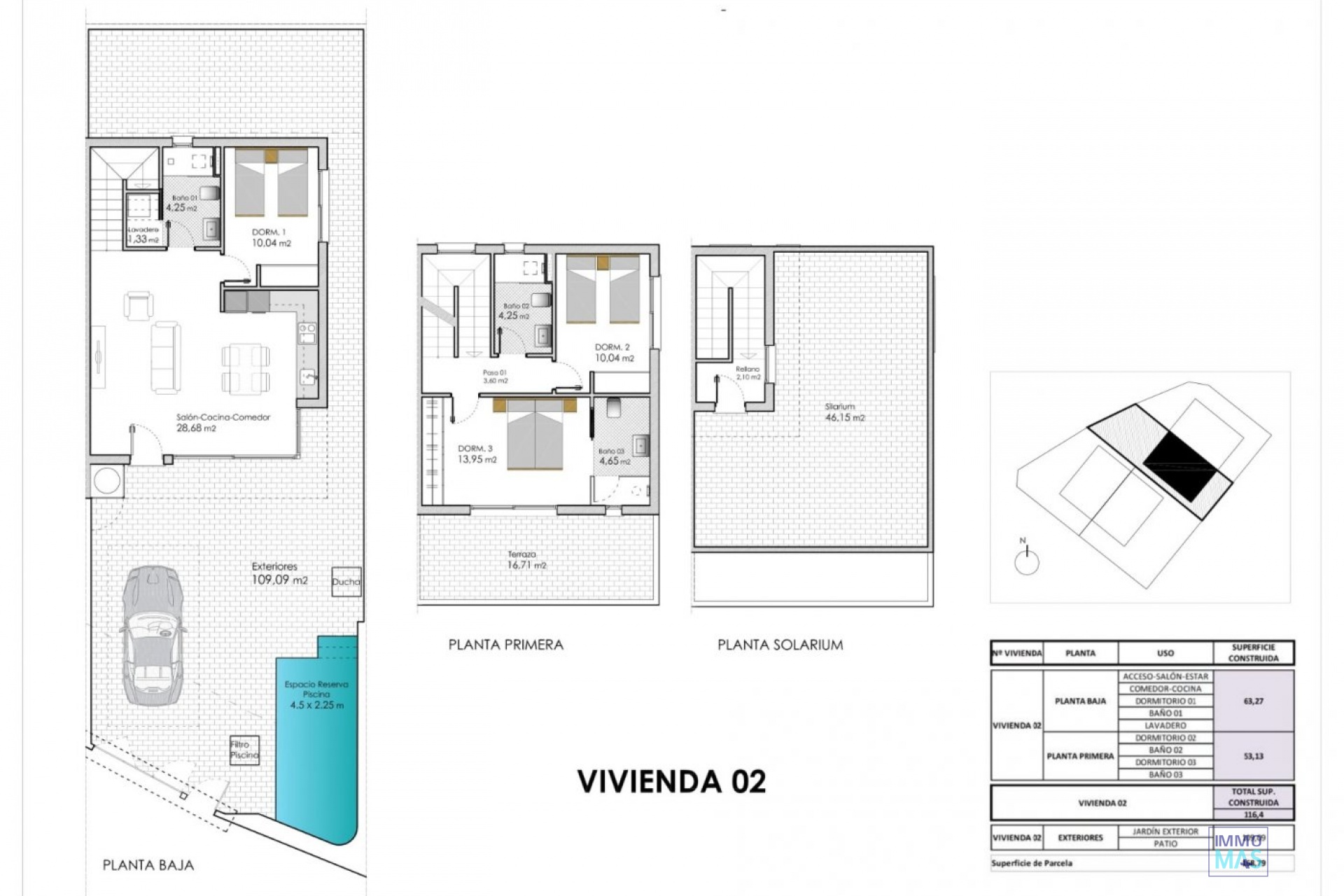 NIEUWBOUW 4 GESCHAKELDE VILLA'S IN PILAR DE LA HORADADA Nieuwbouw 4 geschakelde villa's gelegen in Pilar de la Horadada. Villas gebouwd over 2 verdiepingen en heeft privé solarium, heeft 3 slaapkamers, 3 badkamers, open keuken met de woonkamer, tuin met privé zwembad en parkeerplaats. Villas gelegen op enkele meters van alle diensten en het centrum. Pilar de la Horadada is een typisch Spaans dorp in het meest zuidelijke deel van de Costa Blanca. De grote hoofdstraat heeft supermarkten, veel winkels, restaurants en bars en een aantal mooie pleinen. De prachtige stranden van Torre de la Horadada en Mil Palmeras met fijne zandpromenade liggen op slechts 5 minuten afstand. In Pilar de la Horadada is er ook een goed ontwikkeld fiets- en wandelpadennetwerk, en er is ook een groot aanbod van verschillende sportactiviteiten. De golfbaan Lo Romero met 18 holes ligt op korte rijafstand van de stad. De luchthavens van Corvera (Murcia) en Alicante liggen op respectievelijk 40 en 55 minuten afstand.
