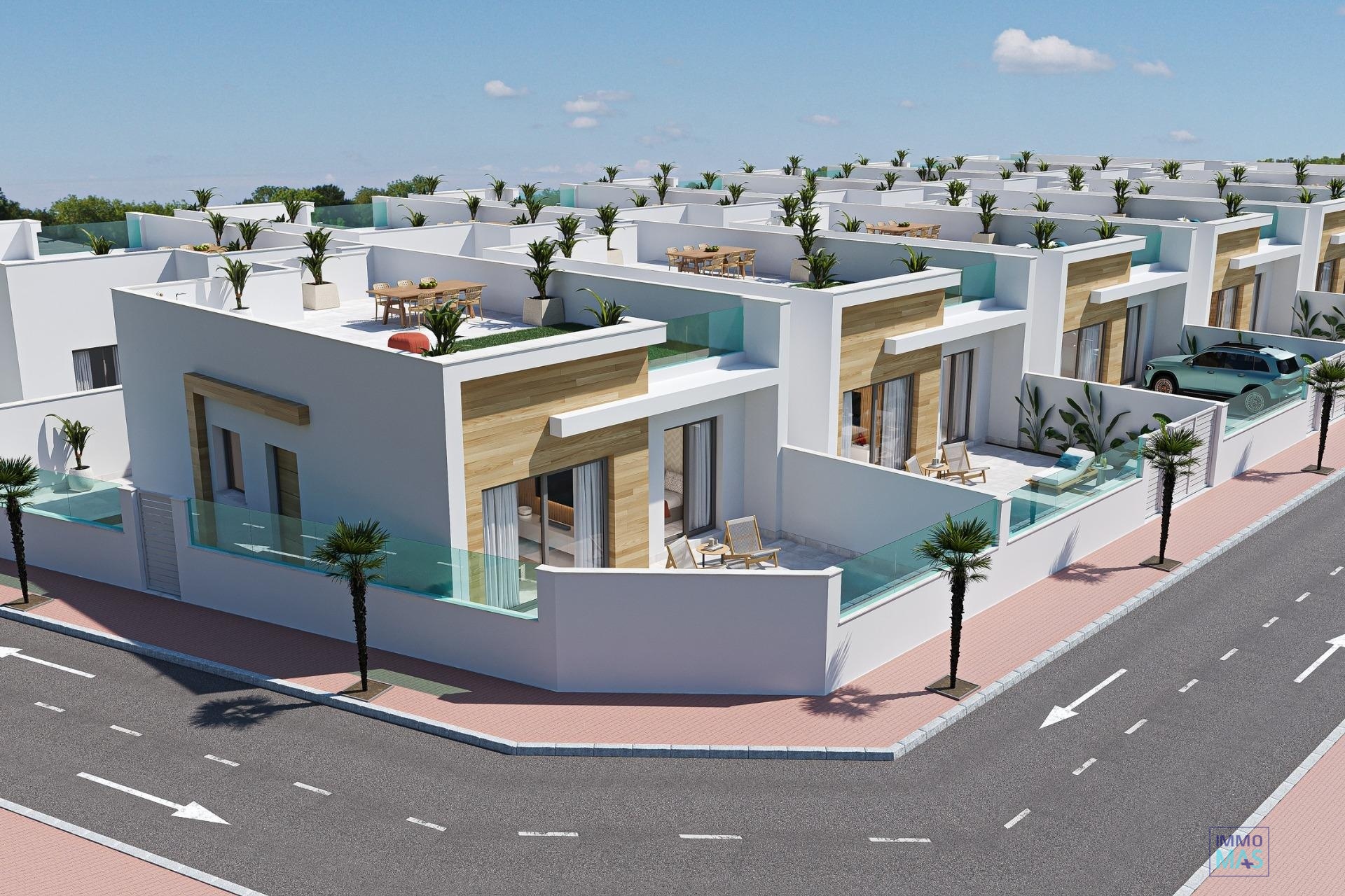 Moderne gelijkvloerse villa's met privézwembad en solarium in El Jimenado Murcia Eigentijds mediterraan wonen met privacy en comfort Dit exclusieve project van 6 onafhankelijke villa's is ontworpen om maximale privacy, comfort en buitenleven te bieden. Gelegen in El Jimenado, een rustige woonwijk die behoort tot Torrepacheco in de regio Murcia, combineren deze elegante gelijkvloerse woningen een modern design met de ontspannen mediterrane levensstijl. Elke villa staat op een eigen perceel met privétuin, zwembad, grote terrassen en parkeerplaats op het perceel, zodat u het hele jaar door kunt genieten van de zon en het buitenleven. El Jimenado staat bekend om zijn rustige omgeving en is tegelijkertijd strategisch gelegen in de buurt van golfbanen, stranden en essentiële voorzieningen, waardoor het ideaal is voor zowel permanent wonen als vakantiegebruik. Open ontwerp en hoogwaardige voorzieningen De villa's zijn zorgvuldig ontworpen met een open indeling, waarbij de volledig uitgeruste keuken naadloos aansluit op de lichte woon- en eetkamer. Grote ramen verbinden de binnenruimtes met de terrassen en het zwembad, waardoor een natuurlijke overgang ontstaat tussen binnen- en buitenleven. Elke woning is voorzien van: Volledig ingerichte keuken met apparatuur Badkamers met spiegel, verlichting en doucheschermen Privézwembad Parkeerplaats op het perceel Binnen- en buitenverlichting inbegrepen, met uitzondering van decoratieve lampen Voorbereiding voor airconditioning Zomerkamer op het privé-solarium Het ontwerp met één niveau zorgt voor comfort en toegankelijkheid, terwijl het ruime solarium op het dak een extra ruimte biedt om te ontspannen, gasten te ontvangen en het hele jaar door van de zon te genieten. Rustige locatie dicht bij golfbanen en de kust El Jimenado biedt een rustige woonomgeving, omgeven door open landschappen en verschillende gerenommeerde golfresorts. Tegelijkertijd is het goed verbonden met de belangrijkste steden van het Mar Menor-gebied en de Middellandse Zeekust. Stranden van Mar Menor 18 km Stranden van de Middellandse Zee 25 km Roda Golf 9 km Mar Menor Golf Resort 10 km La Serena Golf 15 km Jachthaven van Los Alcazares 18 km Luchthaven Murcia Corvera 22 km Luchthaven Alicante 95 km Stad Cartagena 30 km Een ideale keuze voor levensstijl en investering Dankzij hun moderne ontwerp, privacy en uitstekende locatie zijn deze villa's perfect voor mensen die op zoek zijn naar een rustige woning in de buurt van golfbanen en de zee, maar ook voor kopers die op zoek zijn naar een verhuurinvestering met een hoog potentieel in de regio Murcia. Neem vandaag nog contact met ons op voor meer informatie of om een bezichtiging te regelen van deze prachtige nieuwbouwwilla's in El Jimenado. 421
