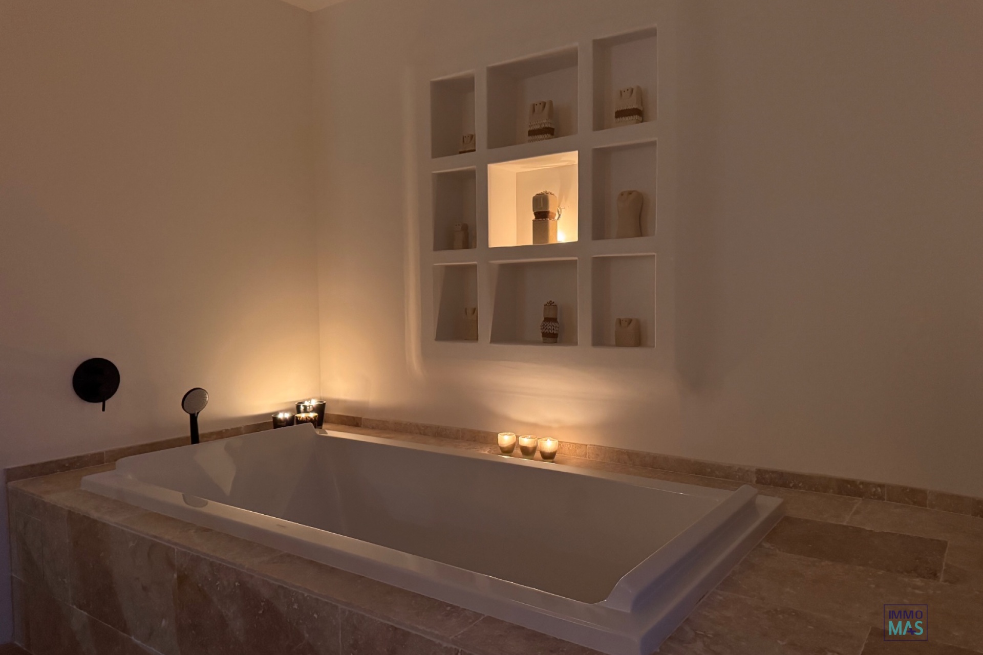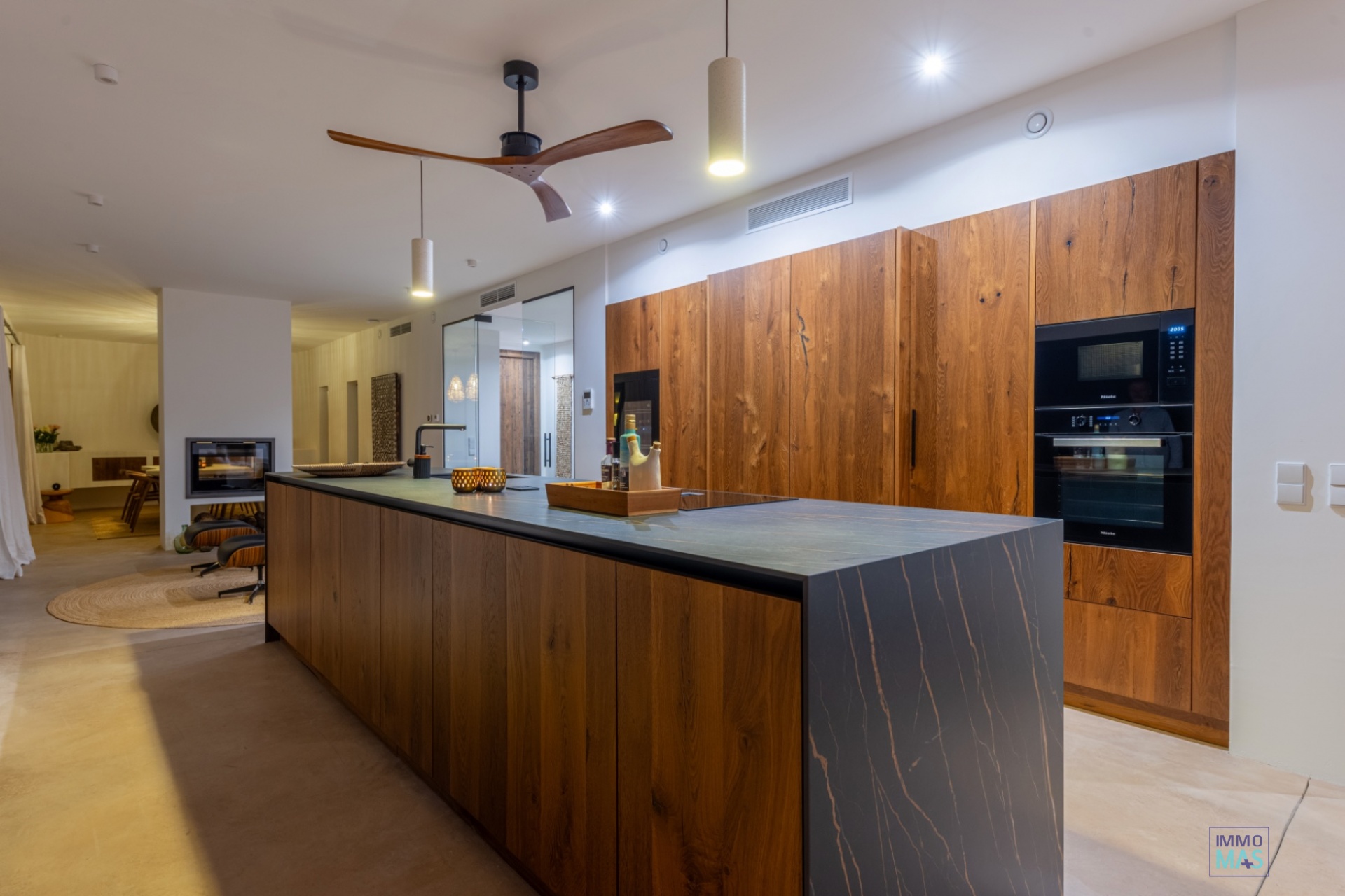 The outdoor lounge is equipped with an American fridge (including ice cube machine), sink and outdoor kitchen – perfect for cosy summer evenings. The Mediterranean garden is tastefully landscaped with palm trees, mature planting and a fully automatic irrigation system.