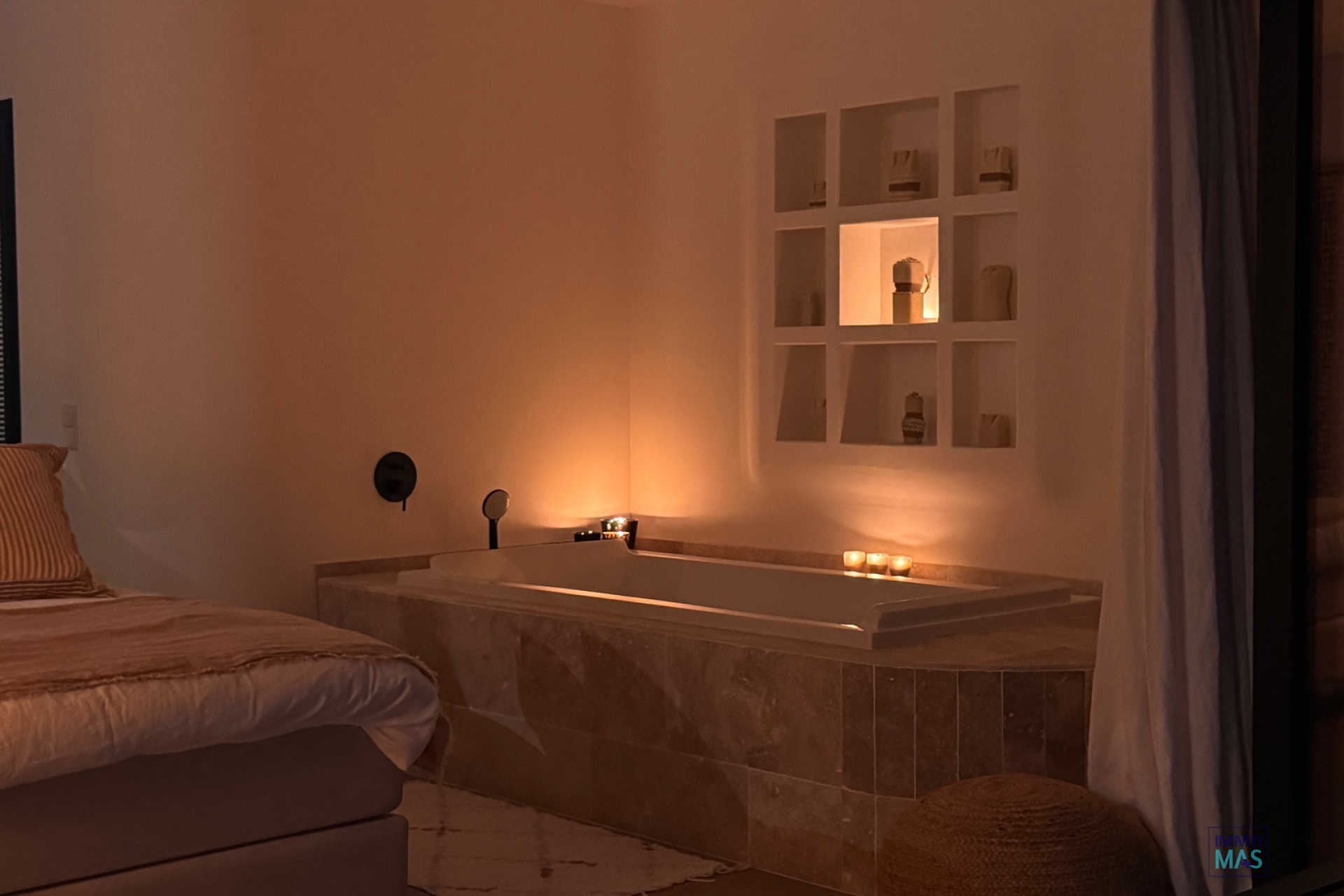 The spacious master bedroom on the ground floor offers direct access to the terrace and features a luxurious bathroom with bathtub, walk-in shower and an exclusive custom-made dressing room in thermally treated Movingui wood (durability class 1). This elegant wood has been used throughout the house and underlines the high-quality finish.