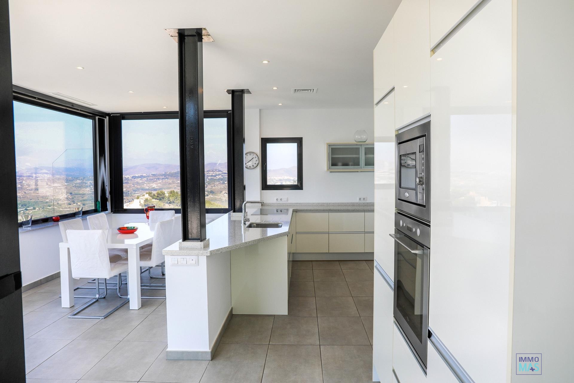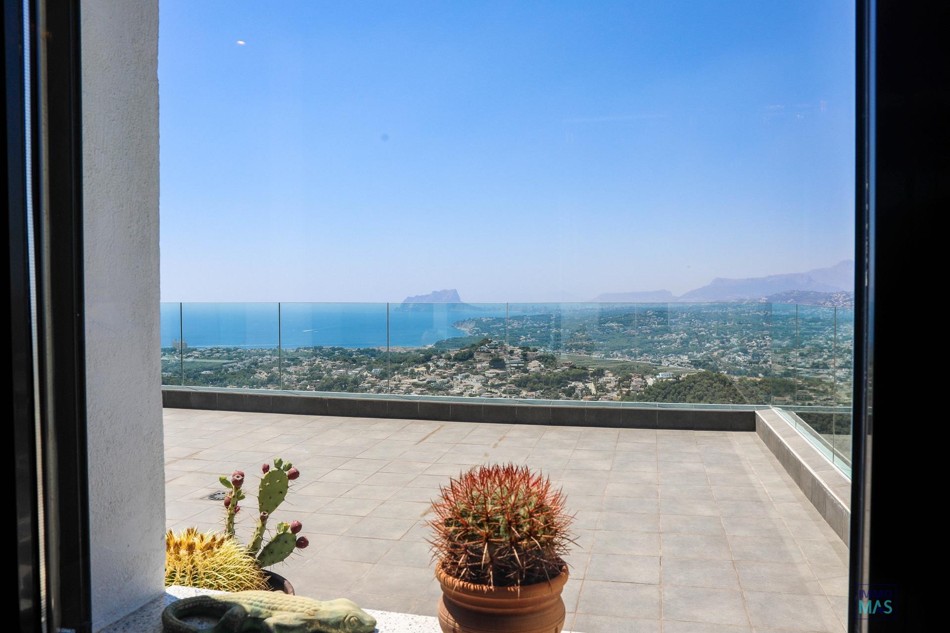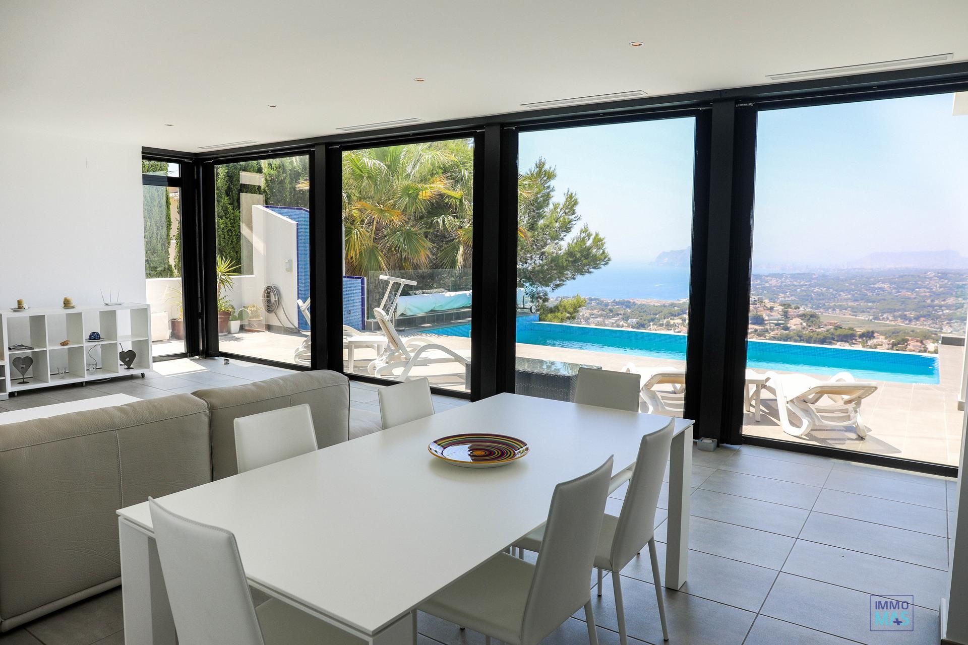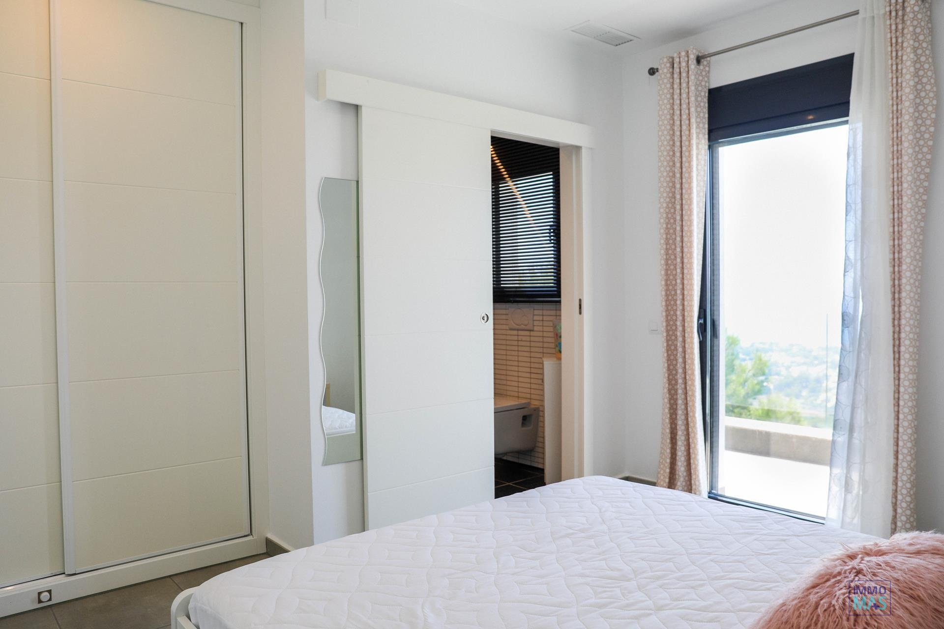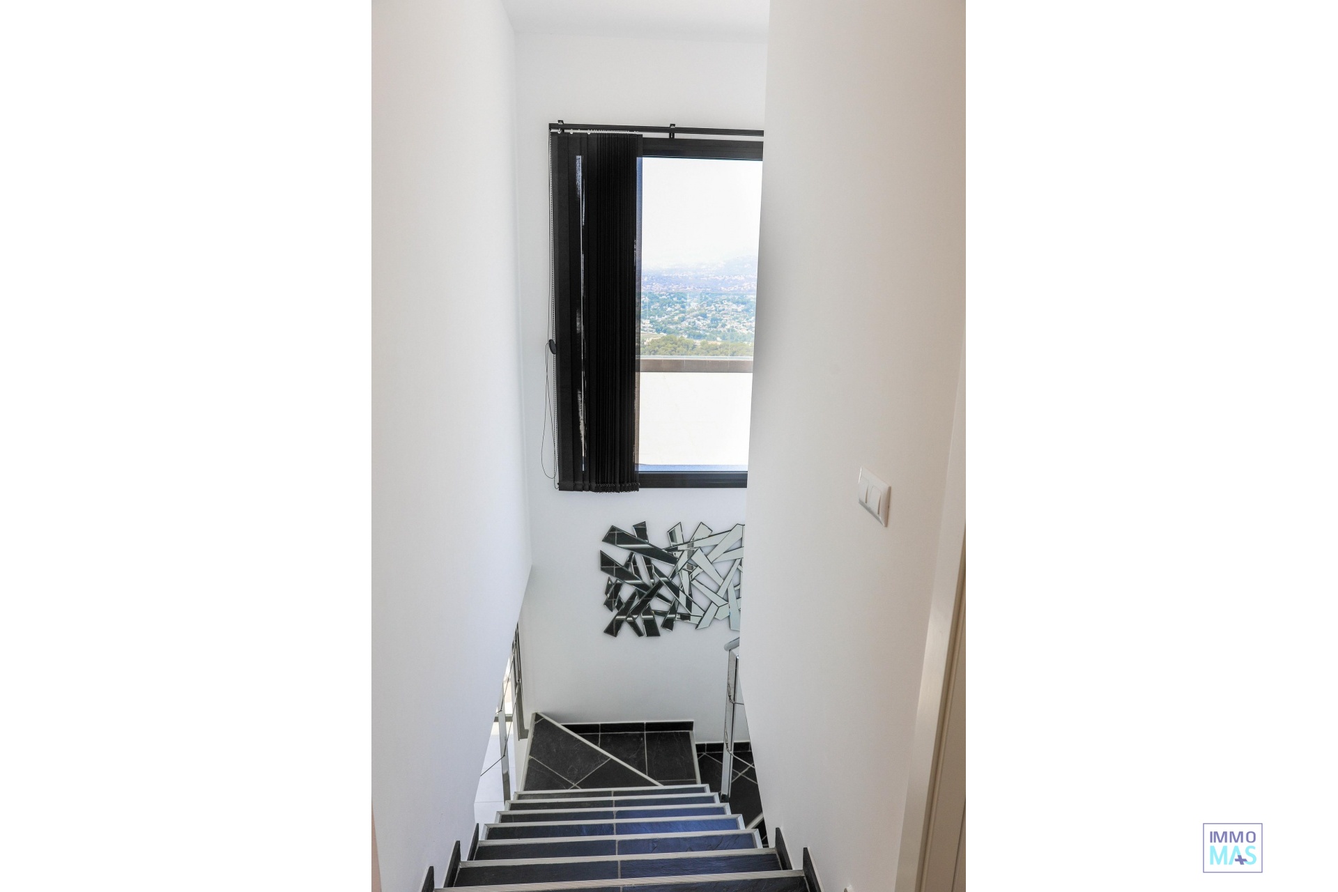 Modern style villa with stunning sea views in the Kalmias residential area of the Cumbre del Sol urbanization located between Jávea and Moraira. It has a total constructed area of 430 m2 (200 m2 of main house, 90 m2 of guest apartment and 140 m2 of terraces), all built on a plot of 1025 m2. In total we have 5 double bedrooms all with their private bathroom. Likewise, the villa is equipped with underfloor heating and air conditioning throughout the house. The villa is built on several levels. We access with the car through a wide and comfortable access ramp, accessing the parking area with a covered area and with access to the villa through the upper floor, on the upper floor we have three double bedrooms each with its own bathroom. bathroom and direct access to the outdoor terrace with spectacular views of the sea and the mountains. Through an internal staircase we go down to the main floor of the villa where we have the living room and kitchen in open concept as well as the laundry room and a courtesy toilet, both from the kitchen area and the living room we can access the terrace exterior with private pool. From the terrace we can access the barbecue area that is located on one side of the villa. From this terrace we can skirt the pool and reach the guest apartment which is also accessible via an external staircase directly from the parking area of the villa. The guest apartment enjoys very nice views from the outside terrace and the living room. Through an internal staircase we go up half a floor to access the two double bedrooms and the two bathrooms. The Kalmias residential area is a development of villas consisting of 189 plots of 750 to 1200M2 located in the cumbre del sol urbanization in Benitachell (Alicante). Almost all the plots enjoy beautiful views of the sea, the Moraira valley with Calpe in the background and the mountains with the Sierra de Bernia in the background, the orientation of the plots can be South and Southwest. Residencial Kalmias is located in the Cumbre del sol urbanization at the south entrance bordering the Jazmines y Lirios residential area. Distances to services: From 1 to 3 km you will find the Dreamsea Mediterranean camp with a bar and restaurant and access to Morach beach, the cala de los tiestos and Cala Llebeig, the Lady Elisabeth international school, the Mercadona supermarket and the equestrian. From 4 to 5 km; the Adelfas shopping center with the Pepe la sal supermarket, hairdresser, maintenance and rental services agency, cafeteria bar, la cumbre restaurant, pharmacy, sports center with paddle tennis, tennis, bar, Mas y Mas supermarket and the center urban Benitachell From 6 to 7 km; the urban center and the beach of Portet de Moraira and the golf course of Jávea. 12 km away is the sandy beach of Jávea