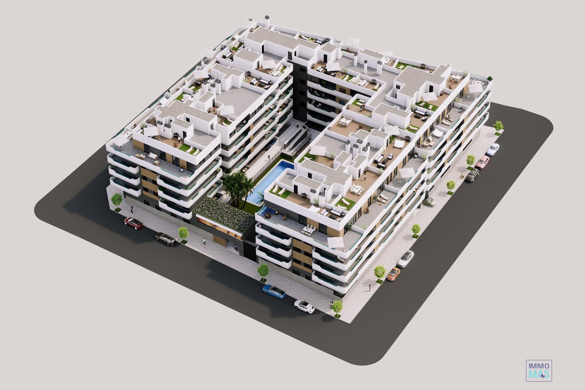 NEW BUILD RESIDENTIAL COMPLEX IN SANTA POLA New Build modern gated residential complex consisting of 1, 2 and 3 bedroom apartments and penthouses with 2 complete bathrooms. The complex consists of 4 staircases of flats with spacious landscaped communal areas, including swimming pool, relaxation area and gymnasium. All properties have been carefully designed to provide you with an exceptional living experience, with high quality finishes and a modern style. Enjoy the spacious terraces, where you can relax, enjoy al fresco dining and watch the most spectacular sunsets. The location is simply unbeatable: next to the centre of Santa Pola and the palm grove, and only a few minutes from the promenade, you will be close to a wide range of restaurants, bars and supermarkets. Excellent connection with the national road 332, which connects all the southern Costa Blanca, and with the airport in only 15 minutes.