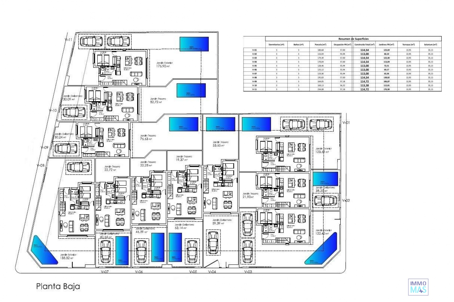 NEW BUILD TOWNHOUSES IN SANTIAGO DE LA RIBERA New Build development of 11 townhouses in Santiago de la Ribera, 100 metres from the beach! Beautiful properties with 3 bedrooms and 3 bathrooms, open plan kitchen with living room, fitted wardrobes, terrace, solarium, private garden with swimming pool and parking space. Just 5 minutes walk along the promenade, next to the yacht club, will take you to the centre of Santiago de la Ribera, with all the services at your fingertips, street market, bars, restaurants, ice cream parlours, shops, water activities and everything you need to enjoy the Mediterranean lifestyle in the Mar Menor. Santiago has a modern feel, although it still maintains its ‘fishing village’ atmosphere. It has a very beautiful promenade, which is lined by majestic palm trees and 2 kilometres of wonderful sandy beaches. From here you can take a boat trip out across the calm waters of the Mar Menor, to the La Manga Strip on the opposite side. The main shopping area is really in the town of San Javier, but there are some some shops in the narrow streets to browse, try visiting on a Wednesday morning when there is a large street market. The villas are walking distance to shops, bars, restaurants, Dos Mares shopping centre and the fantastic beaches of the Mar Menor and 20 minutes to the popular Zenia Boulevard - everything is within easy reach! Just 30 minutes from Cartagena city and the new International Murcia airport.