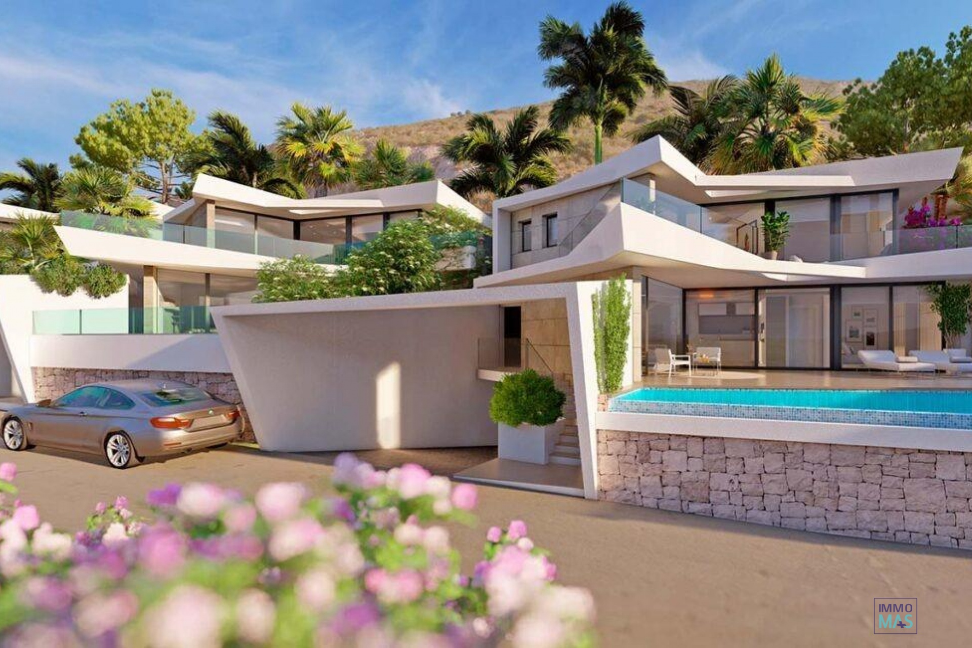 Luxury New Build Villas with Sea Views in Benitachell Exclusive Villas in Golden Valley, Poble Nou de Benitachell Discover this outstanding new build development of 16 independent villas with stunning sea views, located in the prestigious Golden Valley urbanization in Poble Nou de Benitachell, Alicante. This privileged area sits between the popular coastal towns of Moraira and Javea, offering a peaceful residential environment surrounded by nature, yet close to beaches, restaurants and essential services. The elevated position guarantees panoramic Mediterranean views and a tranquil lifestyle on the Costa Blanca. Modern Architecture and Elegant Design These contemporary villas showcase avant garde architecture combined with spacious interiors filled with natural light. Each home has been carefully designed to deliver comfort, privacy and functionality, blending indoor and outdoor living seamlessly. Clean lines, large windows and open plan spaces create an atmosphere of light, sophistication and Mediterranean charm. Spacious Layouts with Private Gardens and Pools Each villa offers approximately 290 m2 built on private plots of over 300 m2. Homes feature 3 or 4 bedrooms, with en suite bathrooms, plus a guest toilet. Distributed over three levels, the layout includes a basement with a private garage for two cars and, in some units, additional space for a gym, extra bedroom, laundry room or storage. The ground floor hosts the open plan living and dining area with a fully equipped kitchen, direct access to the terrace and private swimming pool, one bedroom with en suite bathroom and a guest toilet. The upper floor includes two additional bedrooms with en suite bathrooms and a large open terrace ideal for enjoying sea views. High Quality Features and Energy Efficiency All villas include a private swimming pool, barbecue area and chill out zone. Specifications include electric shutters, an armored entrance door, fully fitted kitchens with Bosch appliances, aerothermal system for domestic hot water, and fully installed ducted air conditioning. The development boasts an A energy rating, ensuring efficiency, comfort and reduced energy consumption. Prime Location on the Costa Blanca Poble Nou de Benitachell is a charming town known for its authentic Spanish atmosphere, beautiful countryside and proximity to some of the best beaches on the Costa Blanca. The area offers supermarkets, restaurants, medical services and international schools nearby. Key distances: Moraira beach 6 km Javea beach 8 km Benitachell town center 2 km La Sella Golf 12 km Marina de Moraira 7 km Alicante Airport 95 km Valencia Airport 120 km Your Dream Home with Sea Views These exclusive new build villas in Golden Valley combine luxury, design and a privileged location with breathtaking sea views. Contact us today to arrange a private viewing and secure your new Mediterranean home in Benitachell. 421