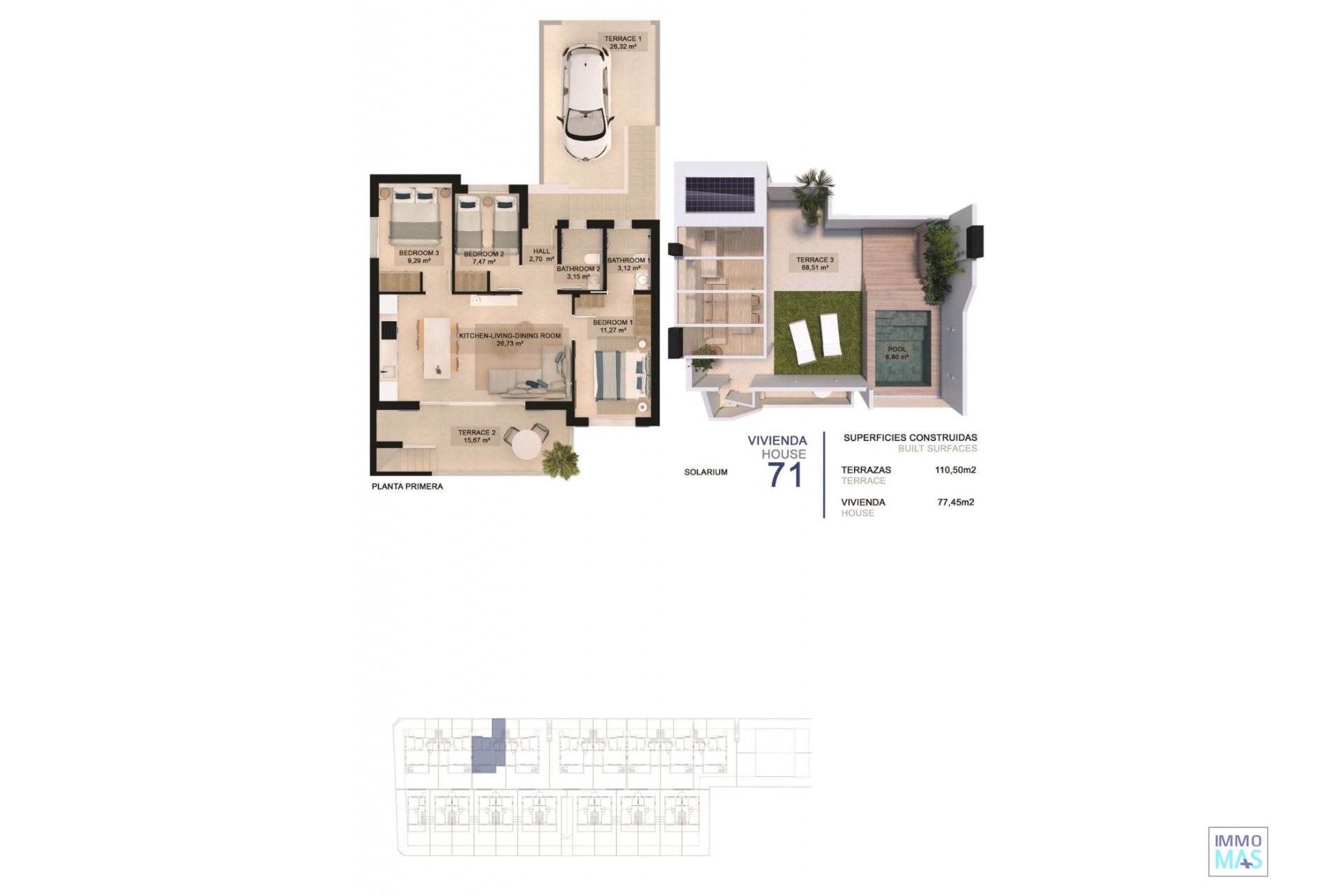 NEW BUILD RESIDENTIAL COMPLEX IN TORRE DE LA HORADADA New Build residential complex of bungalow apartments in Torre de la Horadada only 450m from the beach. All properties has 3 bedrooms, 2 bathrooms, open plan kitchen with the lounge area, fitted wardrobes and terrace. Beautiful bungalows on the ground floor has private garden with the pool, bungalow on the top floor has private solarium with the pool. All properties has private parking. Torre de la Horadada is located south of Alicante in a beautiful location on the coast. The beautiful beaches of Torre de la Horadada and Mil Palmeras have fine sand beautiful promenade. There are lots of restaurants, bars and shops, also water sports, diving and snorkelling. It is well connected just 40 minutes from Alicante and Murcias Corvera airports, with large commercial shopping centres and multiple golf courses all within easy reach. 421