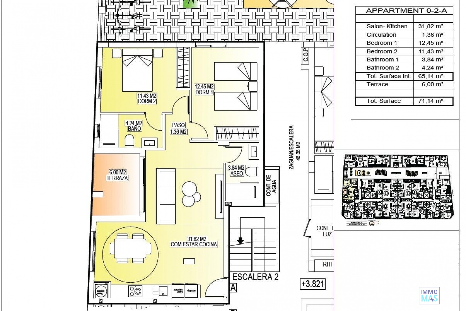 Modern New Build Apartments in the Center of San Miguel de Salinas Contemporary Living in a Healthy Mediterranean Environment Located in the charming town of San Miguel de Salinas, just 10 km from the Mediterranean Sea, this new residential development offers the perfect balance between modern comfort and natural surroundings. The area is well known for its nearby salt lakes and exceptional microclimate, considered one of the healthiest in Europe. This peaceful yet vibrant town allows residents to enjoy the authentic Mediterranean lifestyle while being within walking distance of shops, restaurants, supermarkets and all essential services. San Miguel de Salinas sits slightly inland on the Costa Blanca South, offering open views, fresh air and easy access to beaches, golf courses and shopping areas. Stylish Apartments Designed for Comfort and Efficiency The project consists of two modern buildings separated by a landscaped communal garden area. A total of 56 contemporary apartments are available with 1, 2 or 3 bedrooms, each featuring a private terrace. Every home has been designed with comfort, aesthetics and energy efficiency in mind, using high quality materials and modern insulation systems. Each apartment includes: Armored entrance door Bathrooms with vanity units Pre installation of ducted air conditioning Energy certificate rating A The layout and orientation of the homes ensure natural light throughout the day, creating bright and welcoming interiors ideal for both permanent living and holiday use. Exceptional Communal Areas for Relaxation and Social Life The ground floor communal space is designed as the social heart of the development, surrounded by landscaped gardens, seating areas, bicycle parking and a children’s playground. It is an ideal meeting point for residents of all ages. On the rooftop, an impressive 350 m2 leisure area awaits. This space includes a 70 m2 swimming pool with a separate children’s splash area, pergolas, sun loungers and shaded areas, allowing residents to relax while enjoying panoramic views. The rooftop is easily accessible by one of the three lifts and includes sanitary facilities for added comfort. Excellent Location Close to Key Points of Interest Mediterranean beaches 10 km Zenia Boulevard Shopping Center 9 km Villamartin Golf 6 km Las Colinas Golf 8 km Torrevieja Marina 12 km Alicante Airport 60 km Murcia Corvera Airport 55 km A Smart Investment in Costa Blanca South This residential complex combines modern architecture, quality finishes and a prime central location, making it an excellent choice for living, holiday enjoyment or rental investment. Contact us today for more information or to arrange a visit to these modern apartments in San Miguel de Salinas. 421